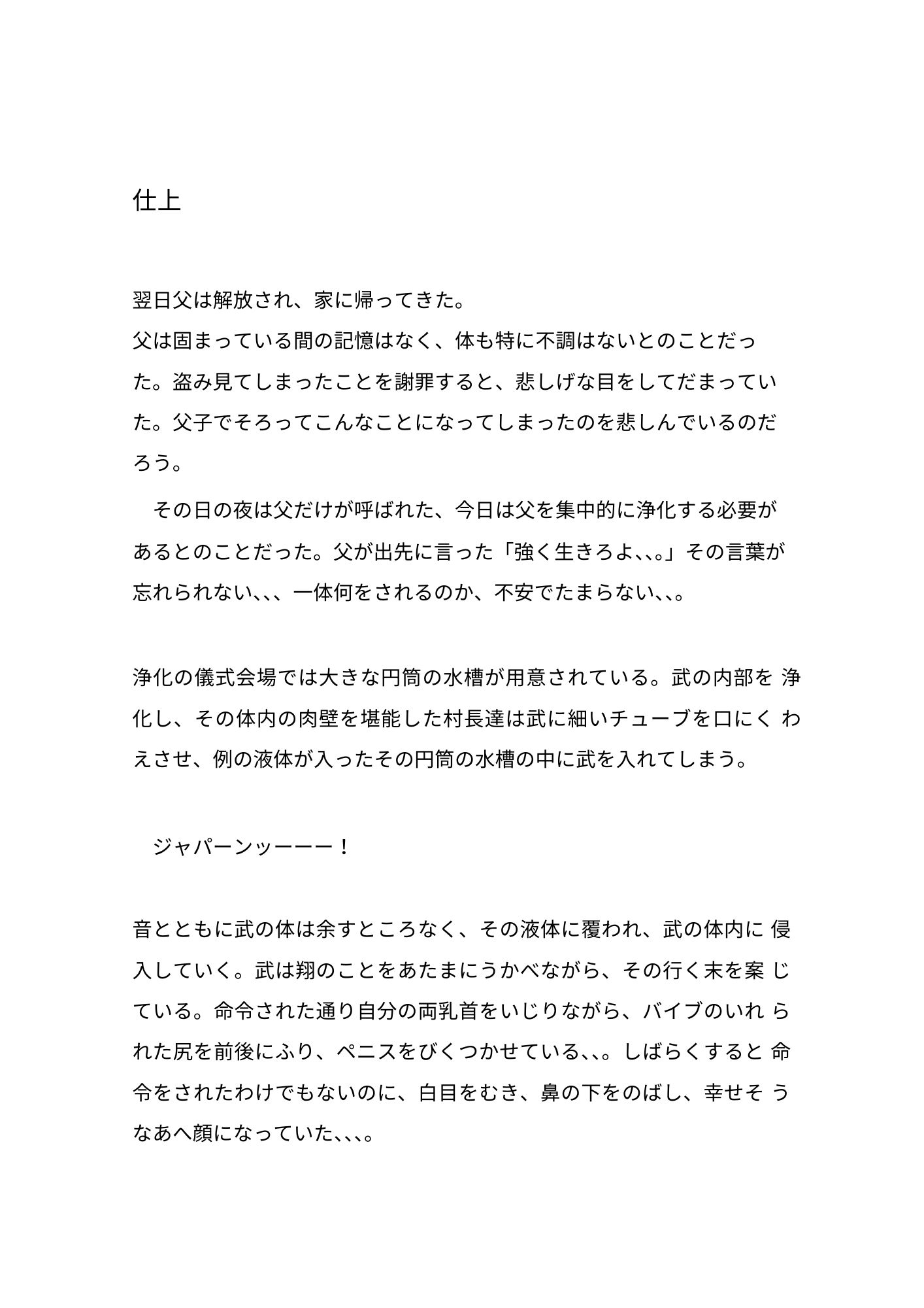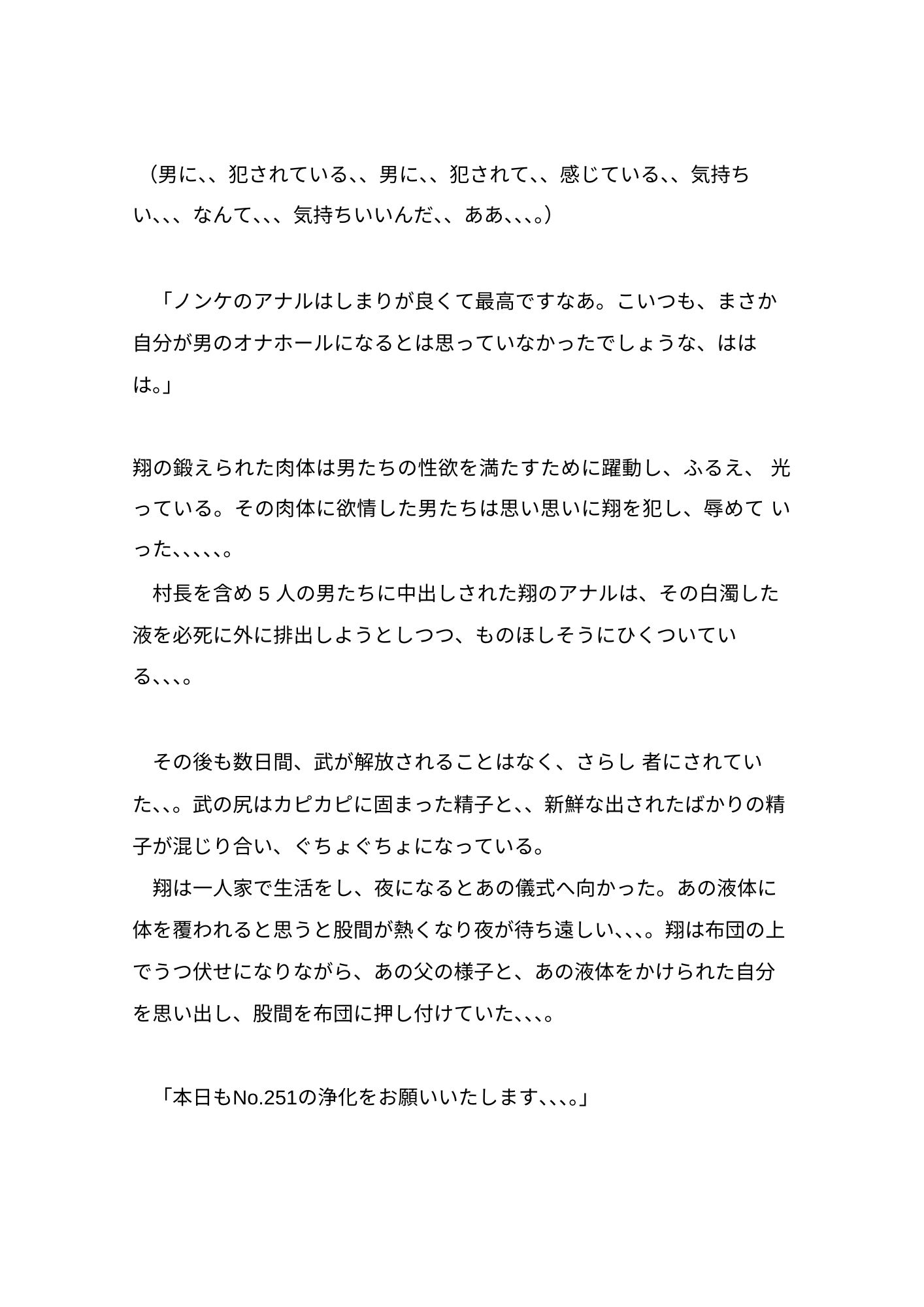 村に移住してきたボディビルダー父子が、村の儀式と称した特殊な液体を使った調教受けおとされていき、、、、。鬼畜、背徳、父子相姦描写ありです、、。