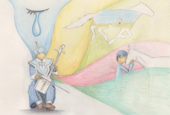 スーホという少年は愛馬の白馬の亡骸で「馬頭琴」という楽器を作って弾きました。これを弾きながら彼らの思い出を浮かびながら哀しく歌っていることを、下描と色鉛筆と白ペンを使って描きました。