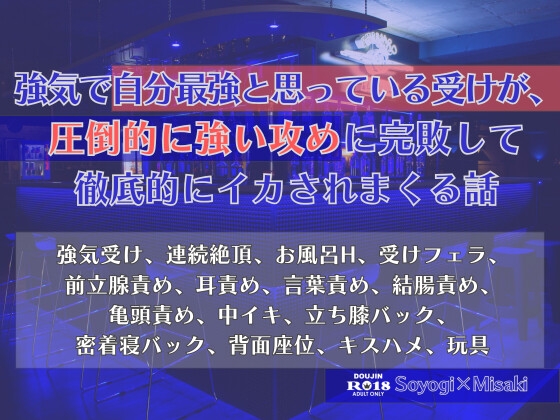 要素:強気受け、連続絶頂、耳責め、お風呂エッチ、受けフェラ、前立腺責め、言葉責め、結腸責め、亀頭責め、立ち膝バック、密着寝バック、玩具