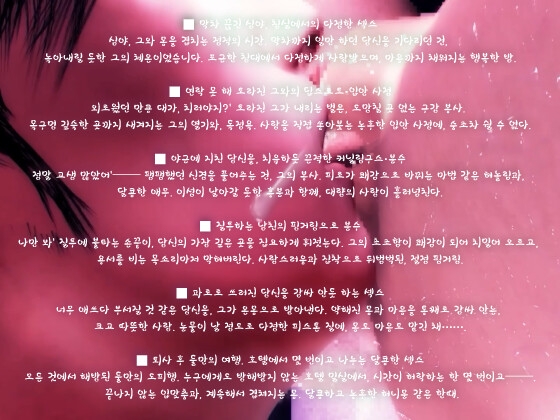 끝나지 않는 입맞춤과, 계속해서 겹쳐지는 몸. 달콤하고 농후한 허니문 같은 한때.* 재생 시간: 1시간 54분 25초