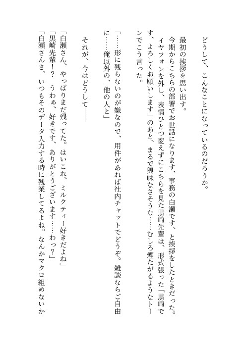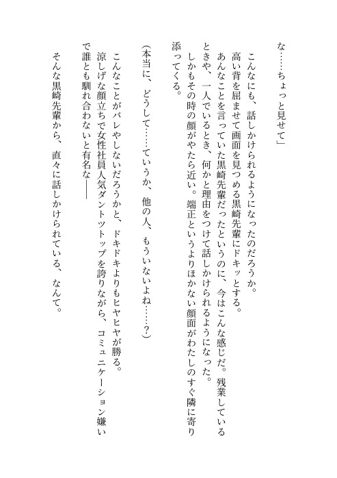 イケメンだが人嫌いな引き抜きの優秀エンジニア・黒崎先輩に二人きりのときにだけ話しかけられるようになった佳奈。確かにゲームという共通の趣味はあったものの不思議に思う中、佳奈は会社近くで行われた飲み会で元所属部署の森下先輩に飲まされすぎてしまう。それを助けてくれた黒崎先輩に少し休んでから帰るよう会社に連れて来られたけれど、なぜかそこで迫られてしまって……!?