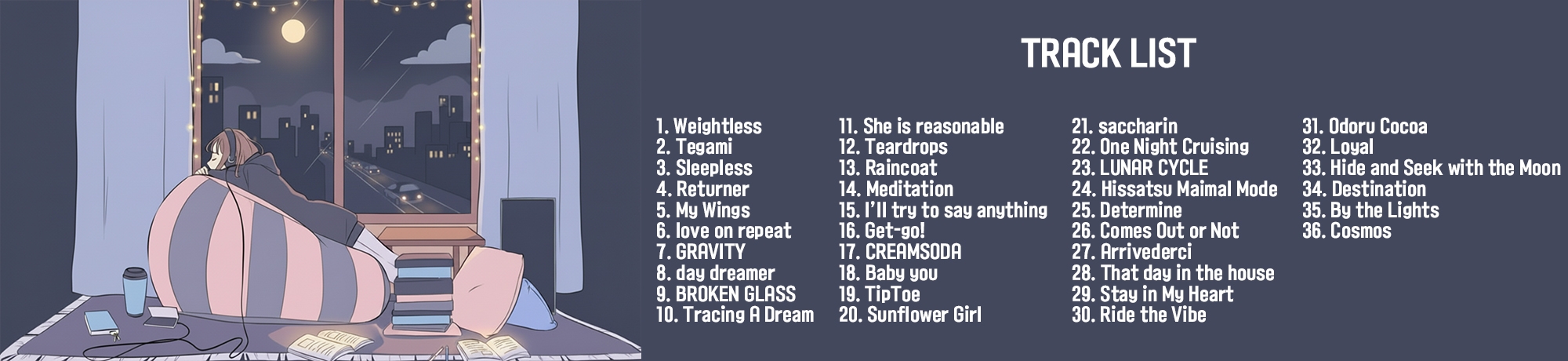 Youtube 「[Playlist] 幸せな夜になりますように | Lo-Fi HipHop」をパッケージした、ロイヤリティフリーのBGM集です。