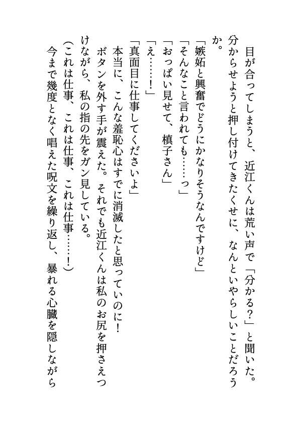 会社にバレたくない一心な槙子は「これは仕事」と自己暗示をかけながら近江に奉仕することに。ところが、近江の溺愛愛撫に身体はいやらしく反応してしまい……。