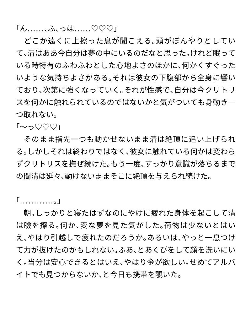 触手、クリ責め、乳首責め、媚薬、睡眠○(意識あり、金縛り状態。夢だと思っている)、焦らし、中出し、鏡プレイ、人外、ホラー、執着責め、尿道責め、膀胱責め、首絞め、濁点ハート喘ぎ