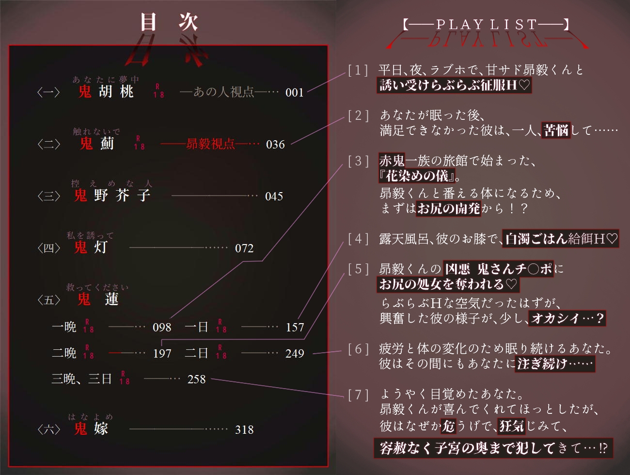 手マン、挑発/おねだり、ゴムあり挿入、体外式ポルチオマッサージ、連続絶頂、潮吹き、脳イキ、あまあま後戯、2回戦、キス、ハグ、なでなで、手繋ぎ、圧迫、言葉責め、耳舐め、指フェラ、お仕置き、焦らし、マンズリ、クリ責め、スパンキング(微量)、寝かしつけ、昴毅くん自慰、ぶっかけ、お風呂、朝の支度、馴れ初め回想、お膝抱っこ、車内イチャつき、親戚の旅館にて儀式の開始、飲酒、唾液給餌、鬼化、角フェラ、乳首イキ、拘束、全身舐め回し、ヒロイン自慰、命令、こすりつけ、アナル開発、アナル舐め、アナルイキ、精液塗布、添い寝、おはよう、フェラ、手コキ、イラマ(和姦)、ごっくん、口移し/精液給餌、膣生挿入、お掃除フェラ、お姫様抱っこ、睡眠○(挿入なし)、膣プラグ、アナル生挿入/アナル処女喪失、アナル中出し、汁ボテ、豹変、連戦、キスマーク、クンニ、膣中出し、子宮○、子宮中出し、発狂、首締め、抱擁、睦言、おはよう、旅館デート、お揃いの監視アプリをインストール、ハッピーエンド♡