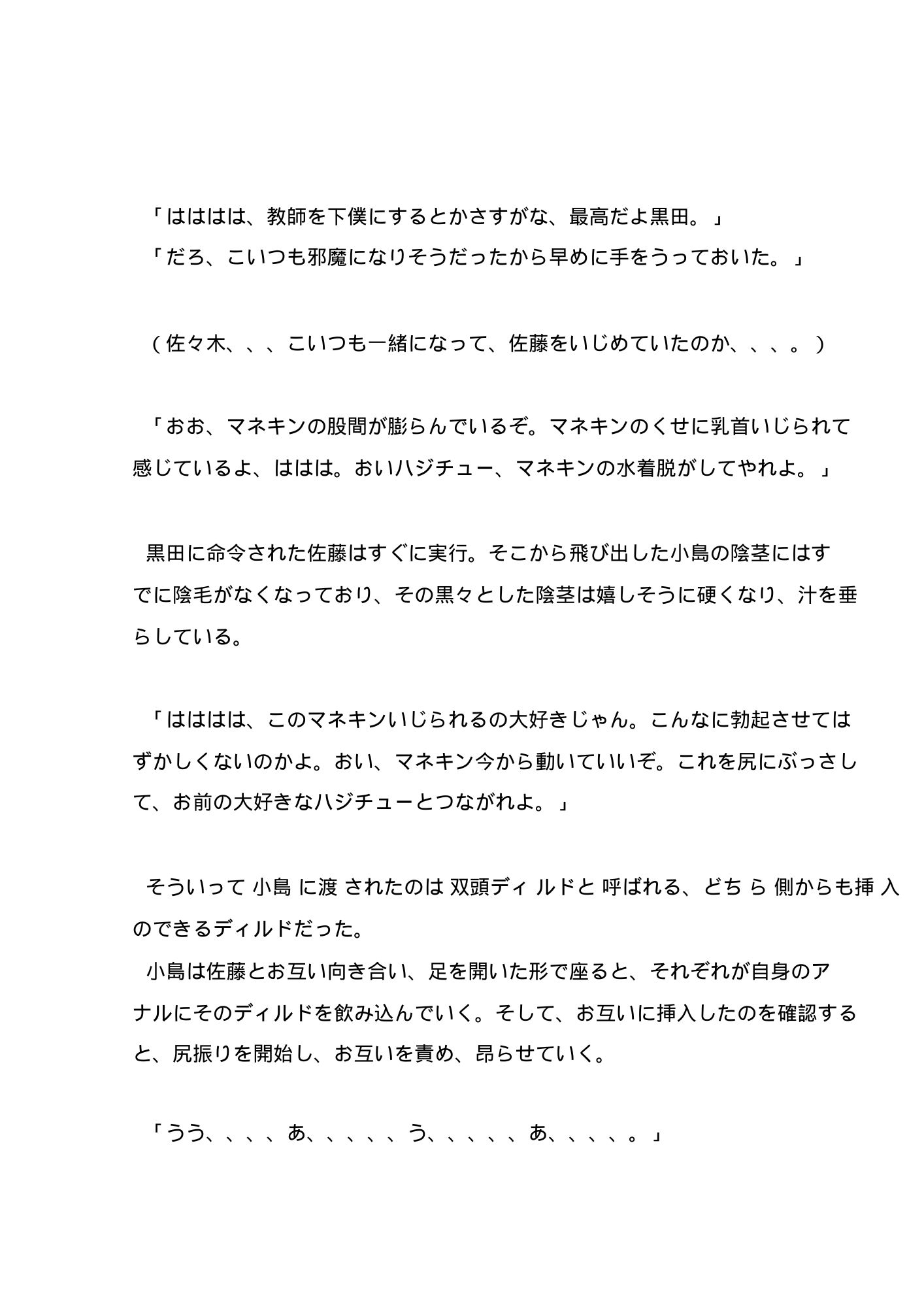 バイブ責め、アナニー、他の生徒の前での羞恥命令、成人映画館、モブ○、アヘ顔、泥酔、売り等。