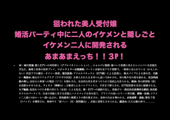丸の内の上場企業で受付嬢を務める斎藤文乃(23)。 若さと美貌、そして高いプライドを持つ彼女は、玉の輿を狙って超高級会員制パーティへ参加します。 そこで出会ったのは、知的なエリート証券マンの吉良と、野性的なIT役員の紅炎寺。 二人のハイスペックな男に選ばれ、勝利を確信した文乃でしたが――そこは、選ばれた女性を「共有の家畜」へと作り変える洗脳と調教の狩り場でした。