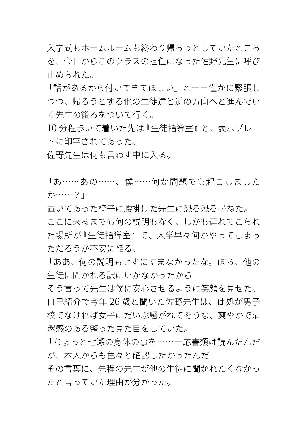 入学した初日に担任に生徒指導室に連れてこられて、「カントボーイを受け持つのは初めてだから」という理由で、おま○こをいっぱい調べられる話です。 始めは下着の上から指し棒でじっくりと調べられてイかされて、その後は下着を脱がされクンニや手マンで潮吹きさせられ、最後はチ○コを挿れられ中出しされます。
