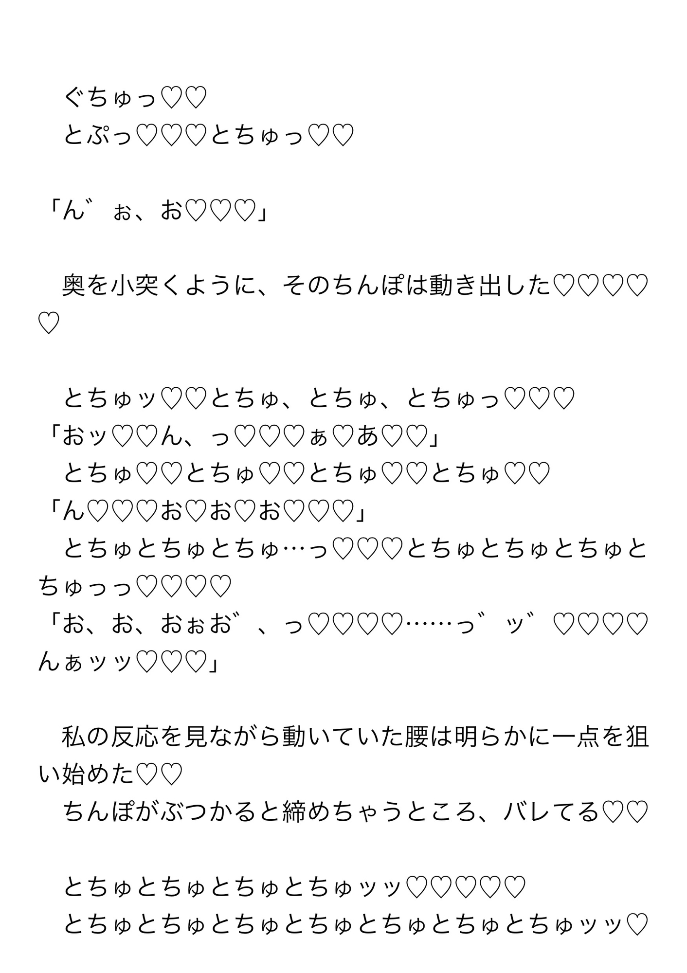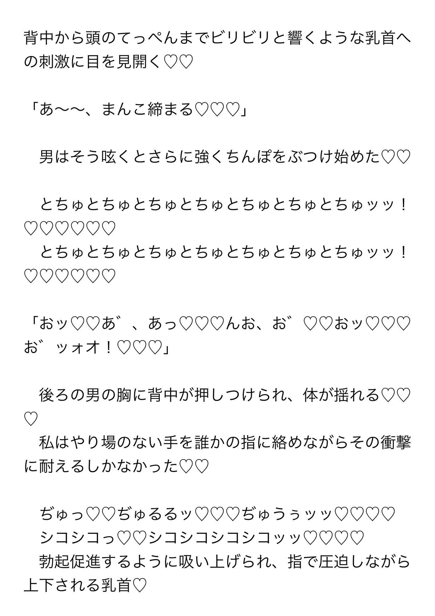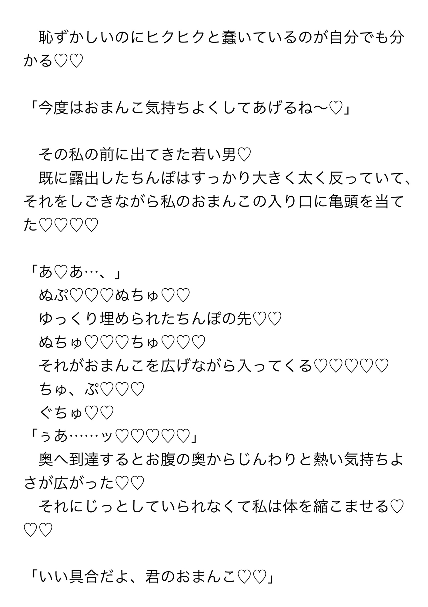 自ら腰を振って快感に溺れていく「私」は、失禁するほど連続でちんぽにイかされ最後には自らちんぽをねだるのだった。