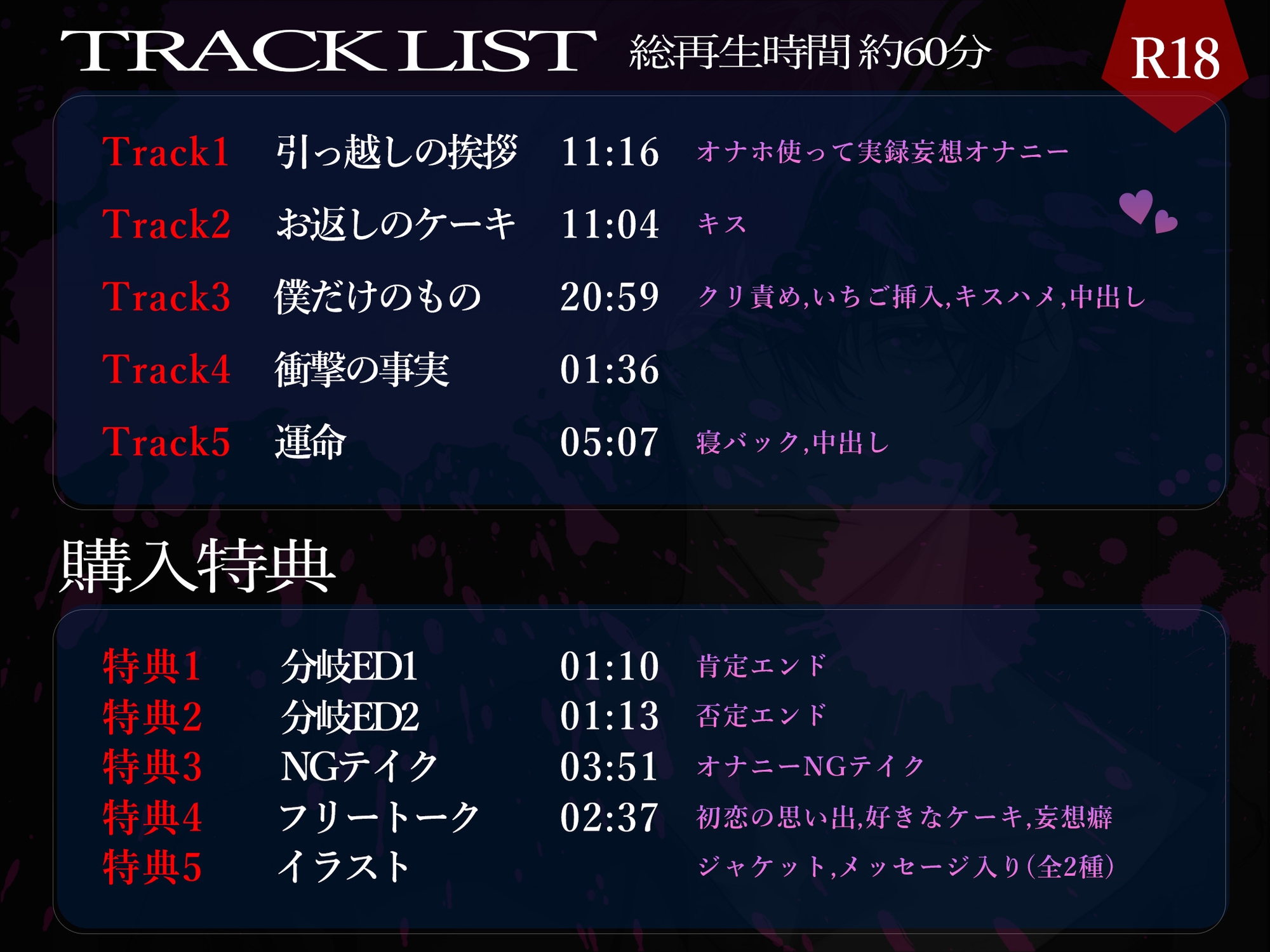 ジャンル:バイノーラル/ダミヘ / ヤンデレ / ラブラブ/あまあま / オナニー / 閉じ込め / 命令/無理矢理 / 潮吹き / 中出し /