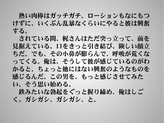 ほぼエロシーンのみ! シチュエーションだけで、めんどうなストーリーはありません。長編でも読み返すのは結局エロいところだけだな......と思ったので、読みたいと思えるものだけを凝縮しました。短いですが、そのぶん濃厚。男が感じる姿を文章でじっくり描写し、淫語にこだわった濃厚なエロ表現とセリフをこってり詰め込みました。また、さし絵を含まない文章作品なのでビジュアルは想像どおり、100%好みに合ったイメージの世界をジャマしません。ヌキたいときにサッと読めて即クライマックス! 使い勝手のいいショートノベルをお楽しみください。