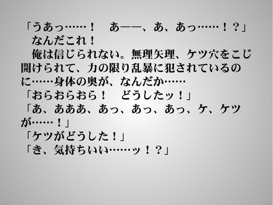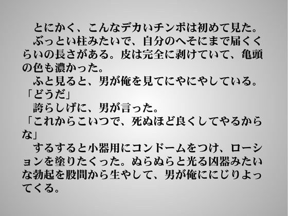 先輩の紹介でビデオモデルのバイトをすることになったアメフト部員。バイト代につられ、からみの撮影をOKしてしまったが、相手の男優はたいへんな巨根で……
