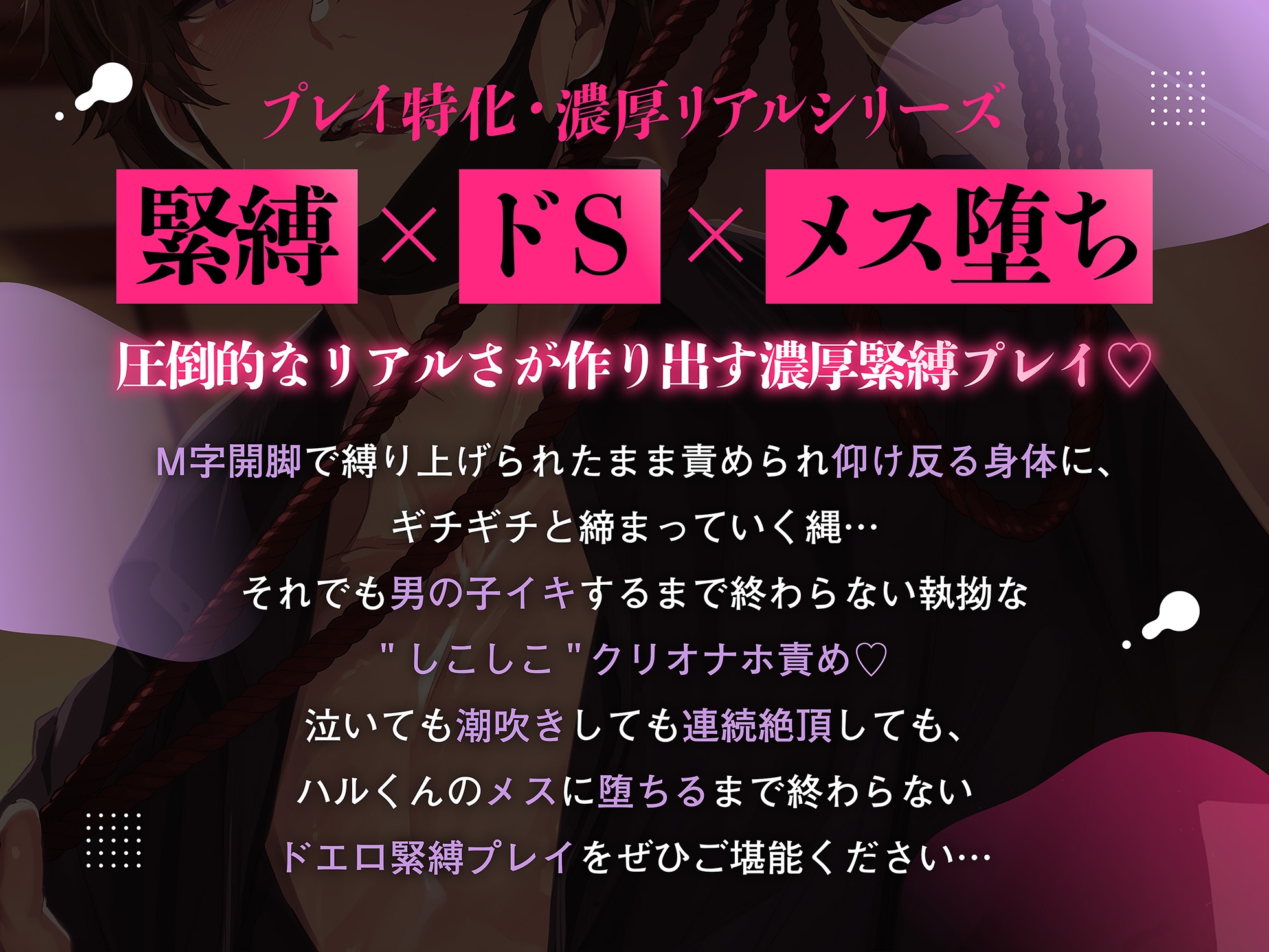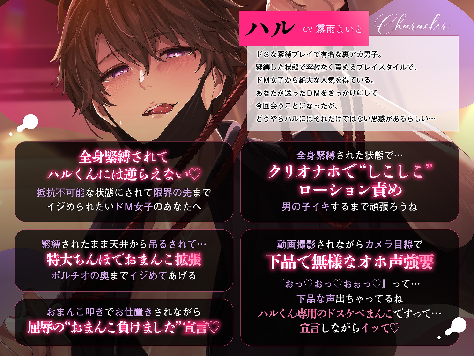 ドSな緊縛プレイで有名な裏アカ男子『ハル』のファンだったあなたは、いつしか動画の女の子のように自分も緊縛されてイジめられたいという願望を持つようになっていた。衝動的にハルにDMを送ると、予想外にOKの返事が……。待ち合わせ場所のホテルに現れたハルは、予想していたよりもベビーフェイスで優し気な青年だった。しかしいざ緊縛プレイが始まるとハルは豹変して……。