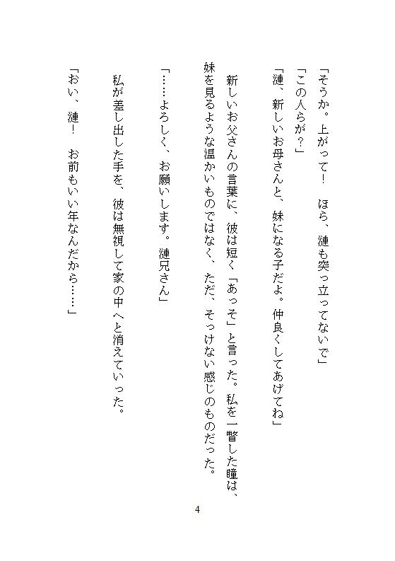 義兄に身体を書き換えられた、ある妹の告白。雨の日は家族に隠れ、お兄ちゃん専用のメスとして、とろとろ絶頂させられる。お母さんには、一生内緒。愛想のない義兄と純朴な妹の、終わりのない背徳の日々が幕を開ける。