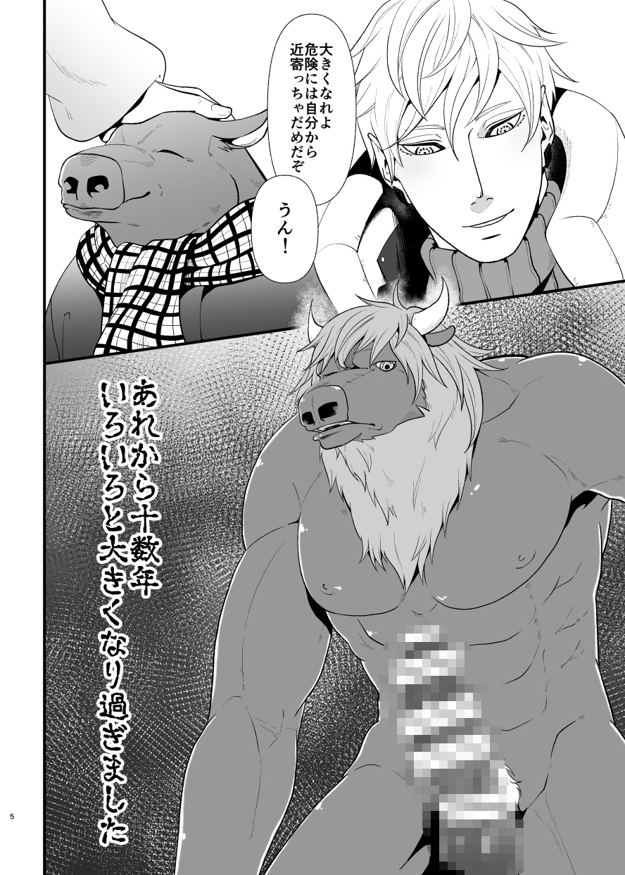 大狼に襲われたところを助けてもらった小さなバイソン。大きくなって再開した人間と恋人になれたが…体格差があり過ぎてアレが挿入できない問題勃発。