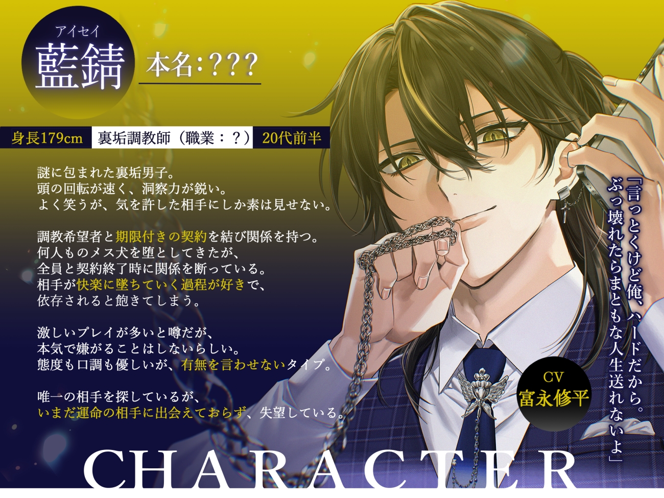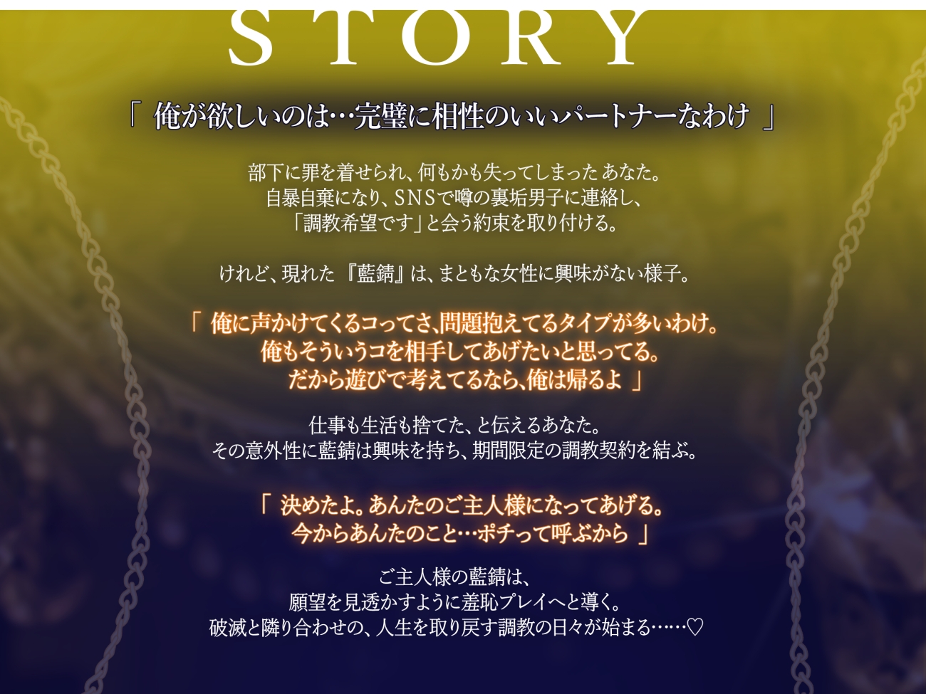 「俺が欲しいのは…完璧に相性のいいパートナーなわけ」主人様の藍錆は、 願望を見透かすように羞恥プレイへと導く。 破滅と隣り合わせの、人生を取り戻す調教の日々が始まる……♡