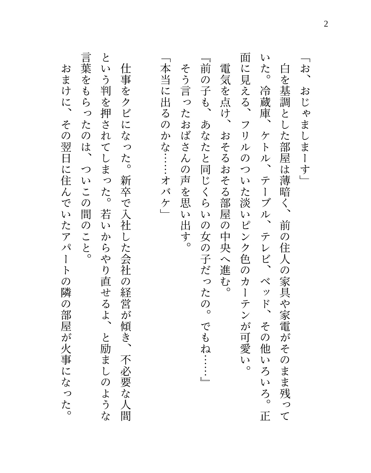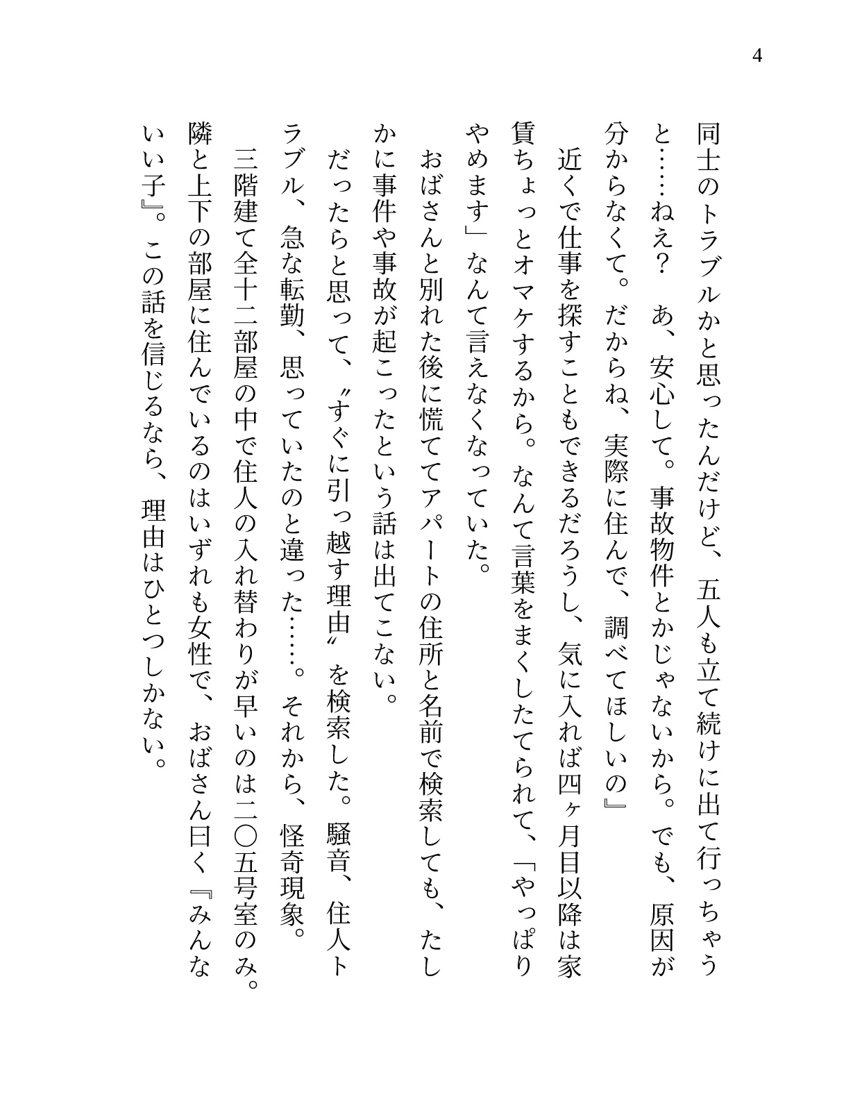 ひょんなことから、住人がすぐに入れ替わるワケアリな部屋に住むことになった流されやすい“私”。