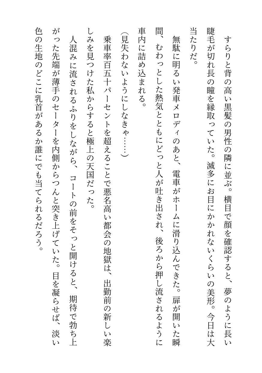 いけないことだと分かっているけど、やめられない。好みの男性に密着すること。体温を味わうこと。その人が私をオカズにしてくれるかもしれない、と妄想すること。それが毎日の楽しみ。