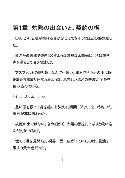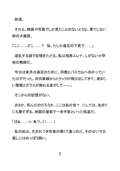 相原エレナ 小学校の教師。真面目で清楚な性格。 事故により異世界へ転移してしまう。 ラシードに拾われ、その強引な愛撫と砂魔法によって、知らなかった快楽を開花させられていく。