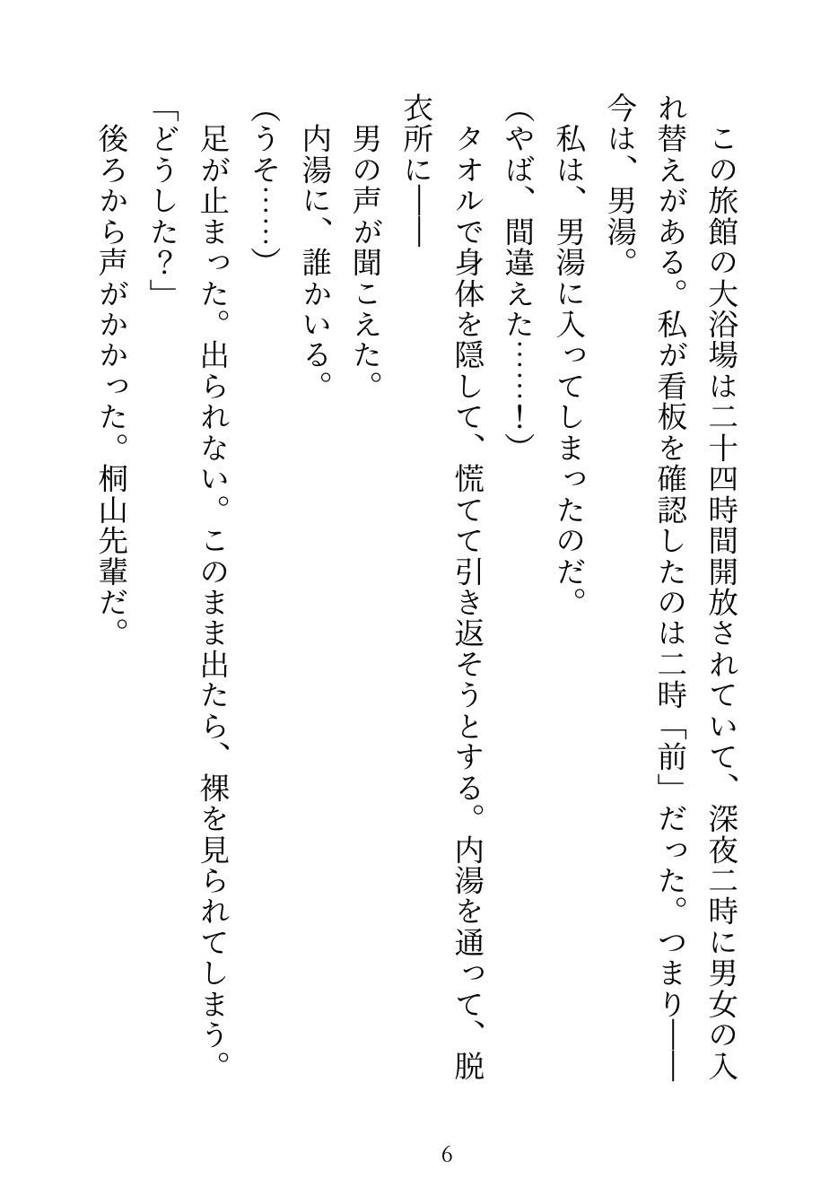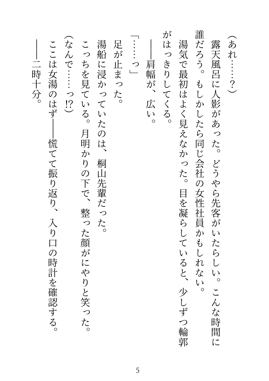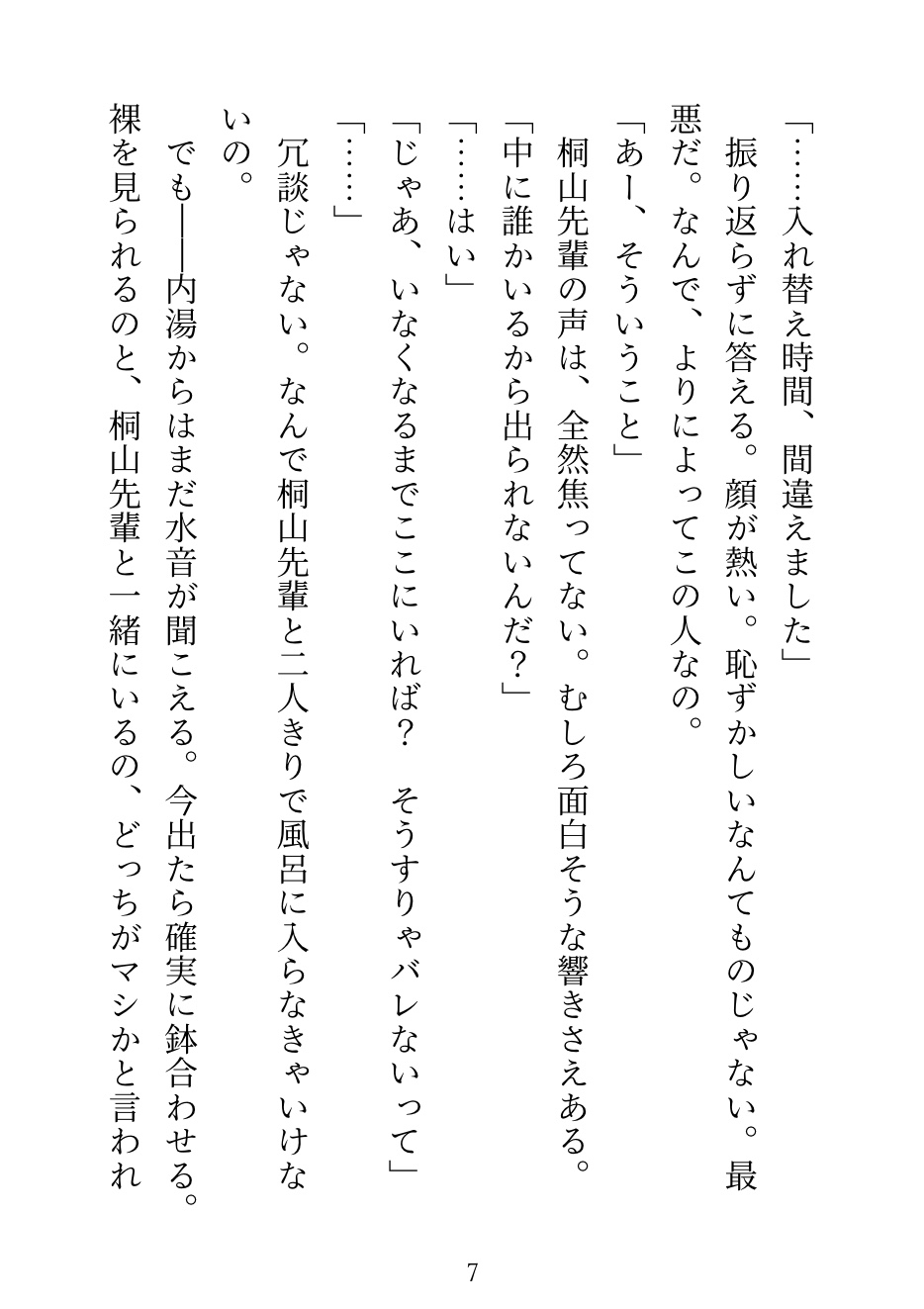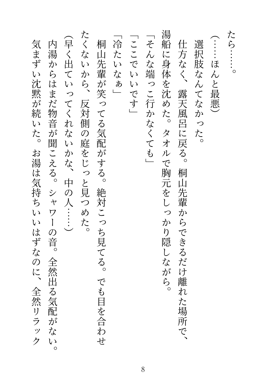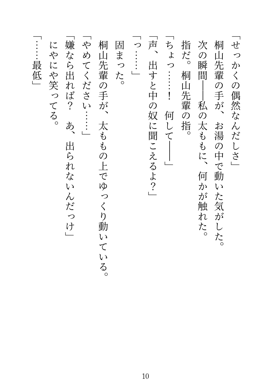 入浴時間を間違えて、男湯に入ってしまった。 そこにいたのは、苦手な先輩。 逃げようとしたら後輩が来て、先輩の膝の上で見えないよう岩陰にうまく隠された。 ——会話しながら、お湯の中で弄られ続けた社員旅行の夜。