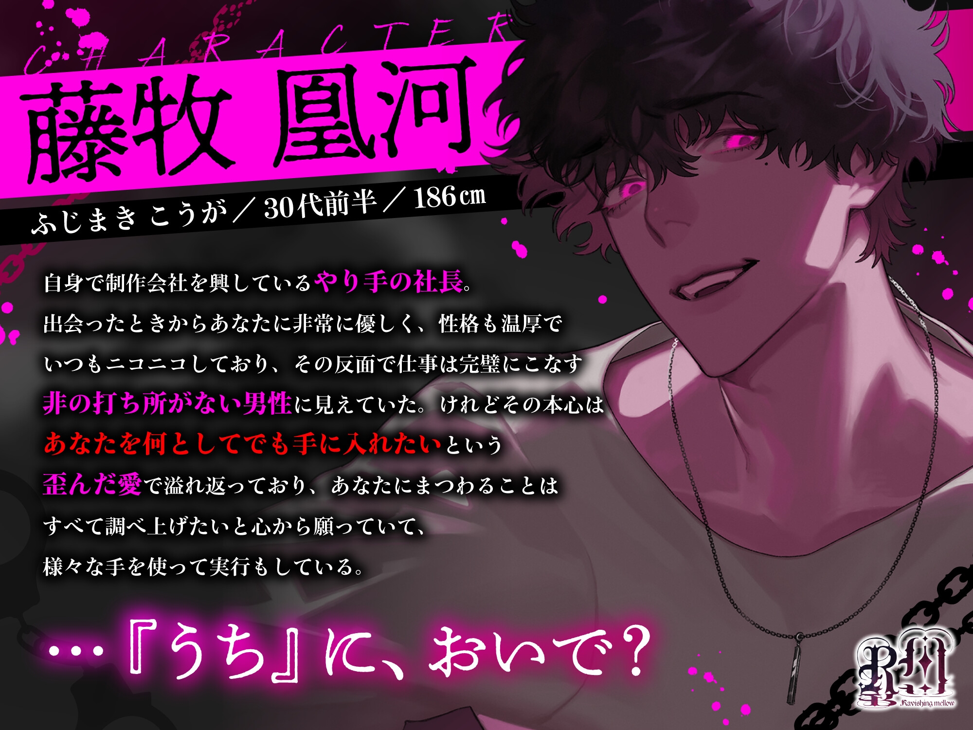 会社員として働くあなたは今の職場に不満があった。そんなある日、取引先の相手の1人「藤牧凰河」というやり手の社長があなたの仕事っぷりを評価し、自身の会社にスカウトしたいとまで言ってくれた。「迷うくらいなら…うちにおいで?」あなたは彼の会社に転職することを決め、迎えた初出勤日。あなたを出迎えた彼の表情はいつもとちょっと違って見えたような気がしたのだが…?【CV:富永修平】