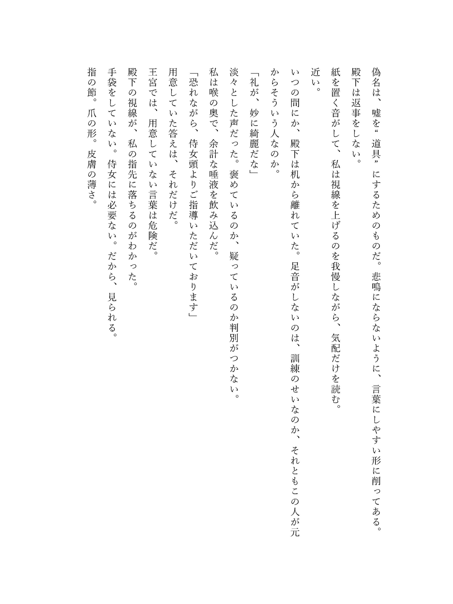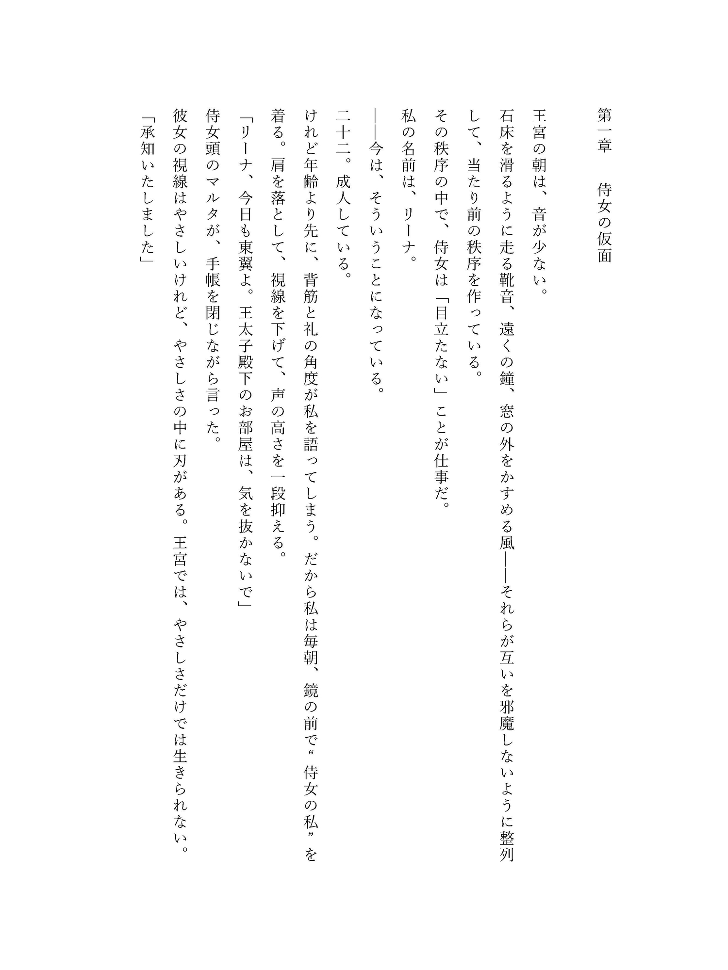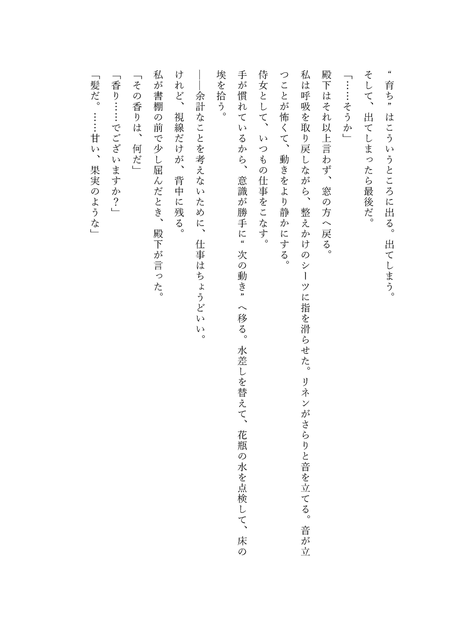 没落貴族の娘である彼女は、名を捨てて王宮の侍女として働いていた。目立たず、静かに、過去を隠して生きる——はずだった。 けれど王太子は、彼女の礼儀も視線も、嘘の匂いさえ見逃さない。 正体が露見した夜、逃げ道は塞がれ、代わりに与えられたのは「側付き」という名の檻。 冷たい宮廷で、二人きりの会話だけが熱を帯びていく。