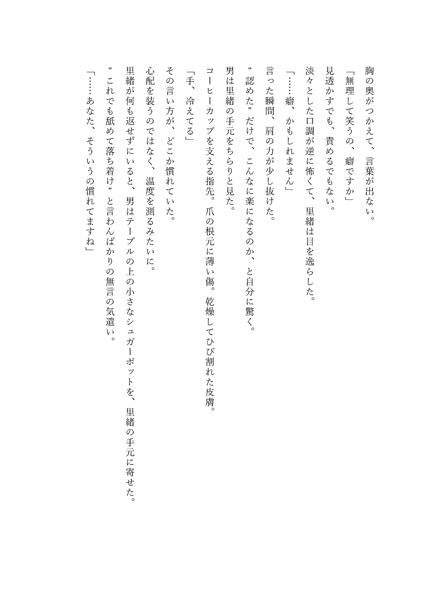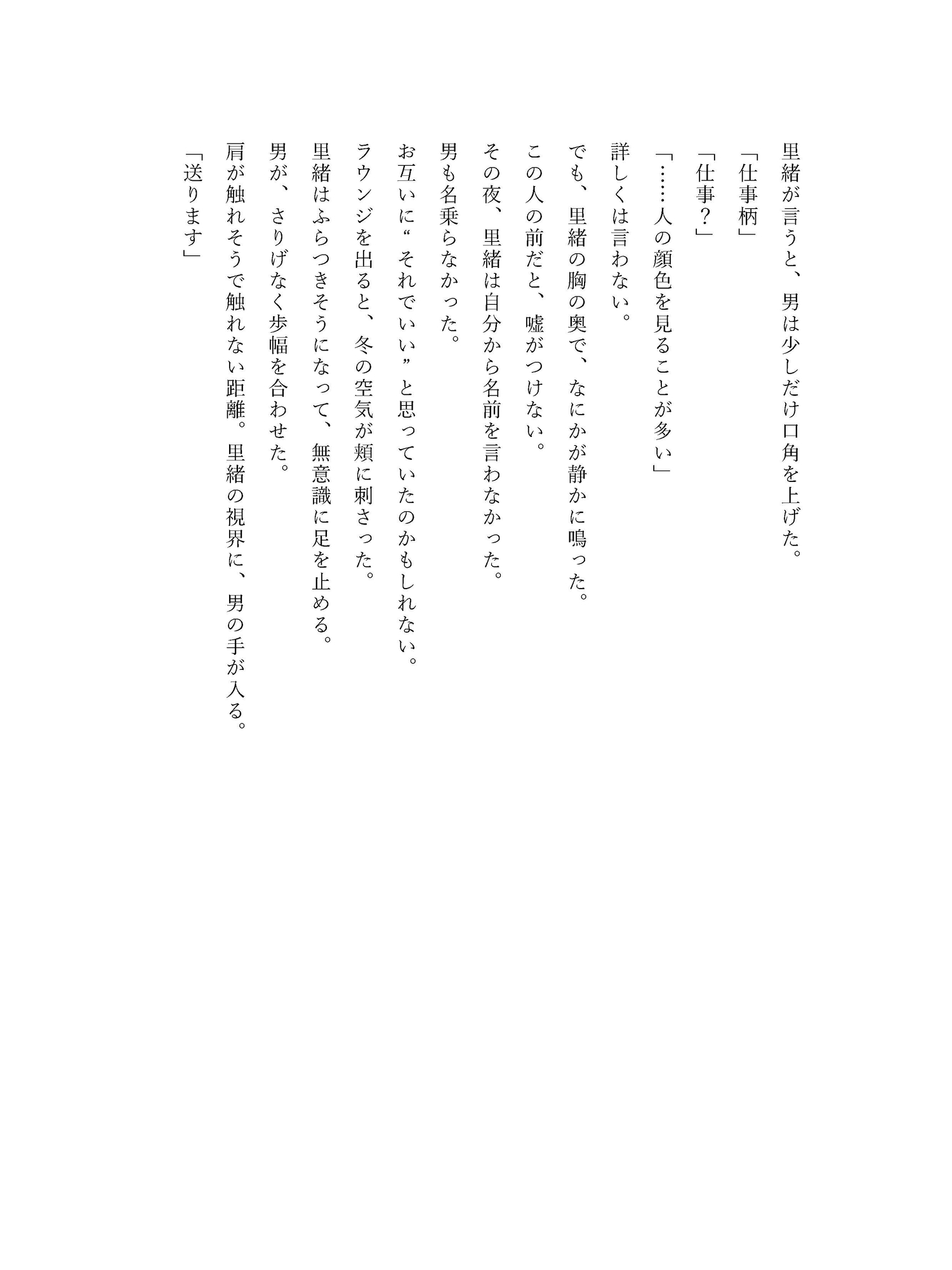 過労で倒れた里緒が紹介された先は、近所の総合病院。 白衣の担当医が名乗った瞬間、里緒は息をのむ。——一夜の相手、橘先生だった。 診察室では冷静に症状を聞き、淡々と生活指導をするのに、診察が終わると「送ります」と立ち上がる。 そして病院の外、駅までの帰り道だけ、何も言わずに手を繋いでくる。 “患者さん”と呼ぶくせに、触れ方だけが恋人みたいで——里緒は、その境界線に溺れていく。