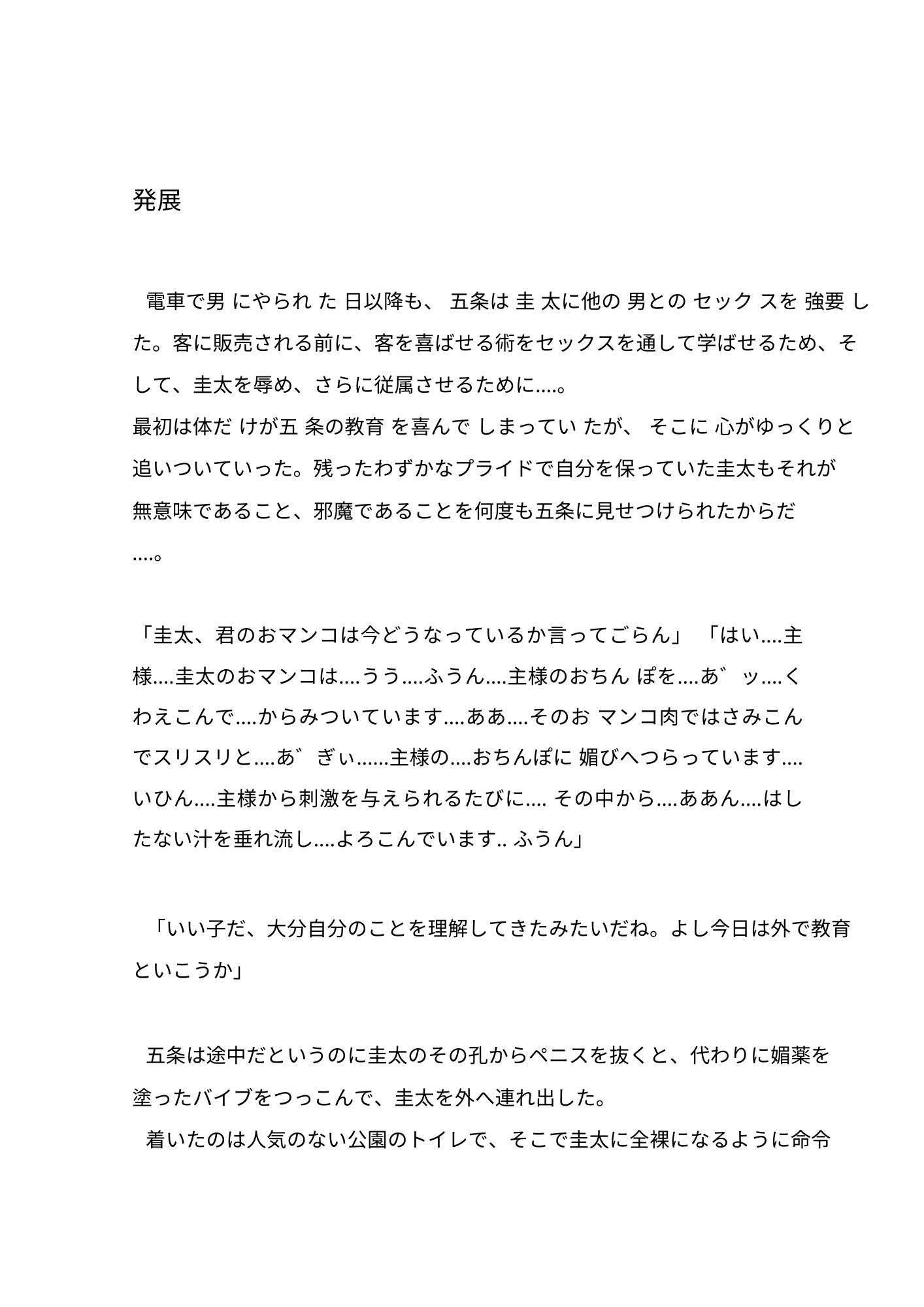 変態露出狂のカントボーイ(女性器をもつ男性)を捕まえた警察官八雲圭太が、その変態露出狂の主人である五条剛にカントボーイ化ウィルスを打たれて、代わりの奴○、販売用の商品にされていく‥‥。