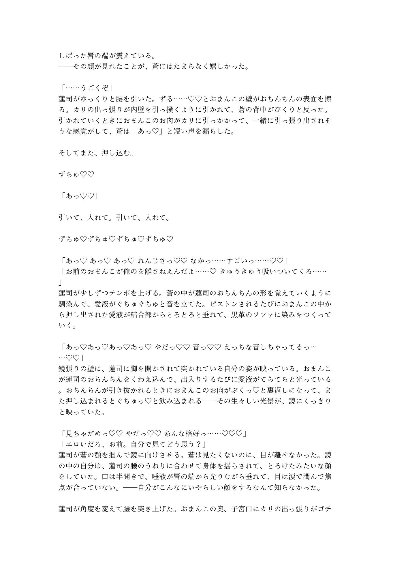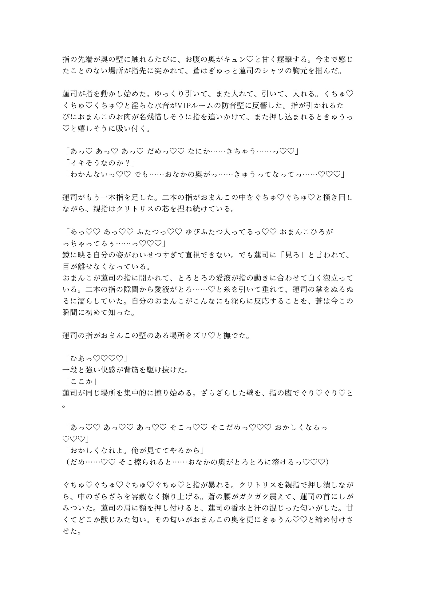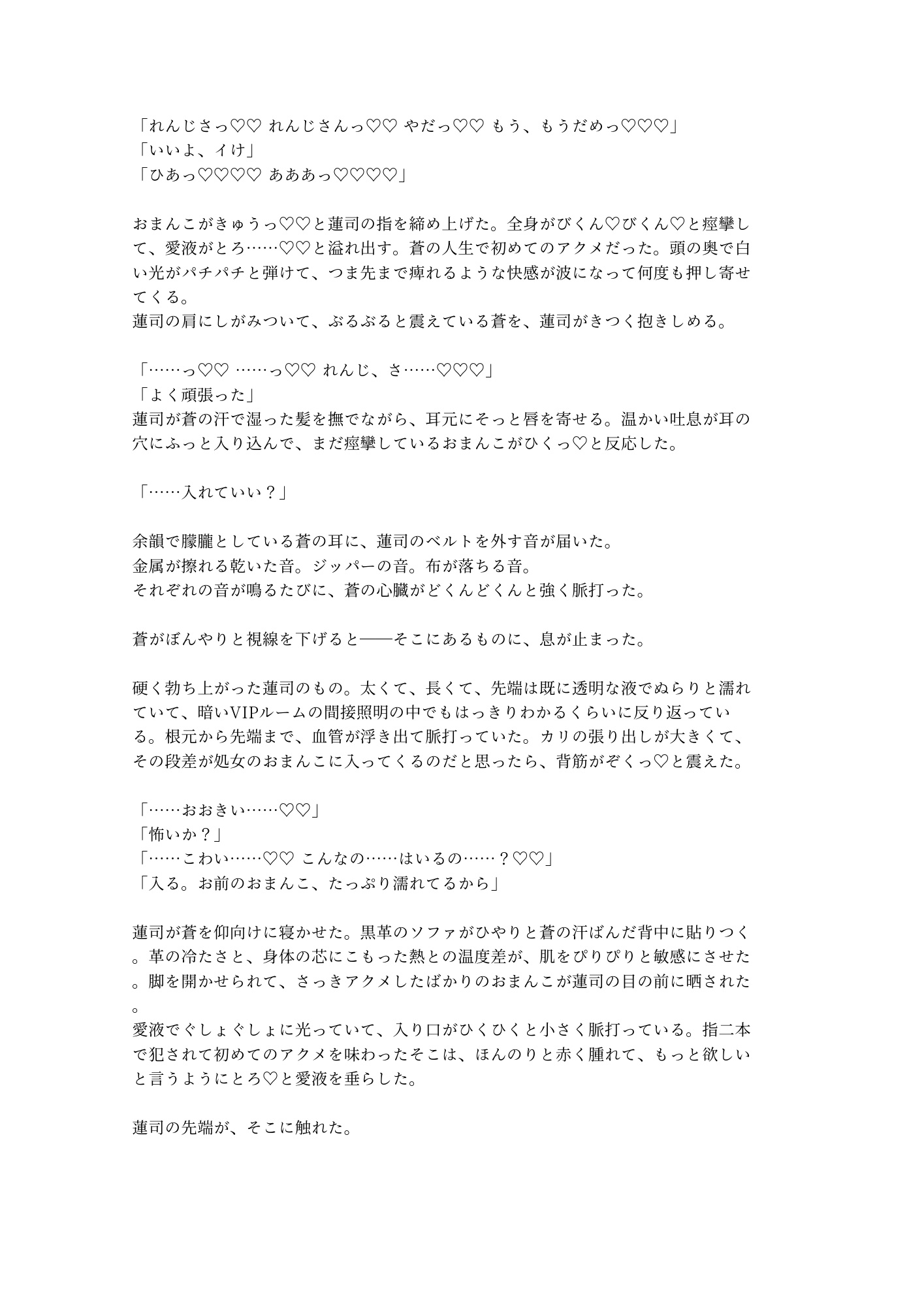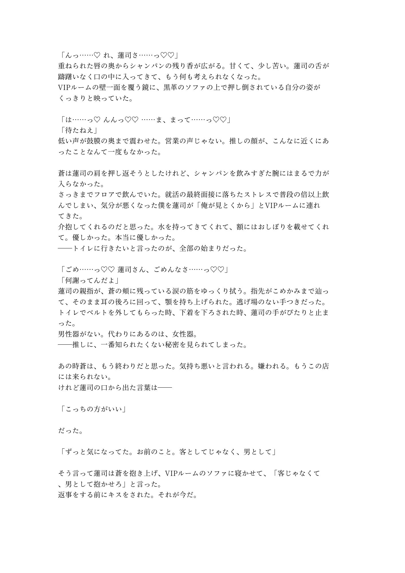 営業スマイルの奥に隠していた剥き出しの獣が、蒼だけに牙を剥く。鏡張りのVIPルーム、黒革のソファ、シャンパンの残り香。逃げ場のない密室で、推しと客の関係が壊れていく。触れられたことのない身体が初めての快感に震え、コンプレックスだったはずの秘密が二人を繋ぐ鍵に変わる。