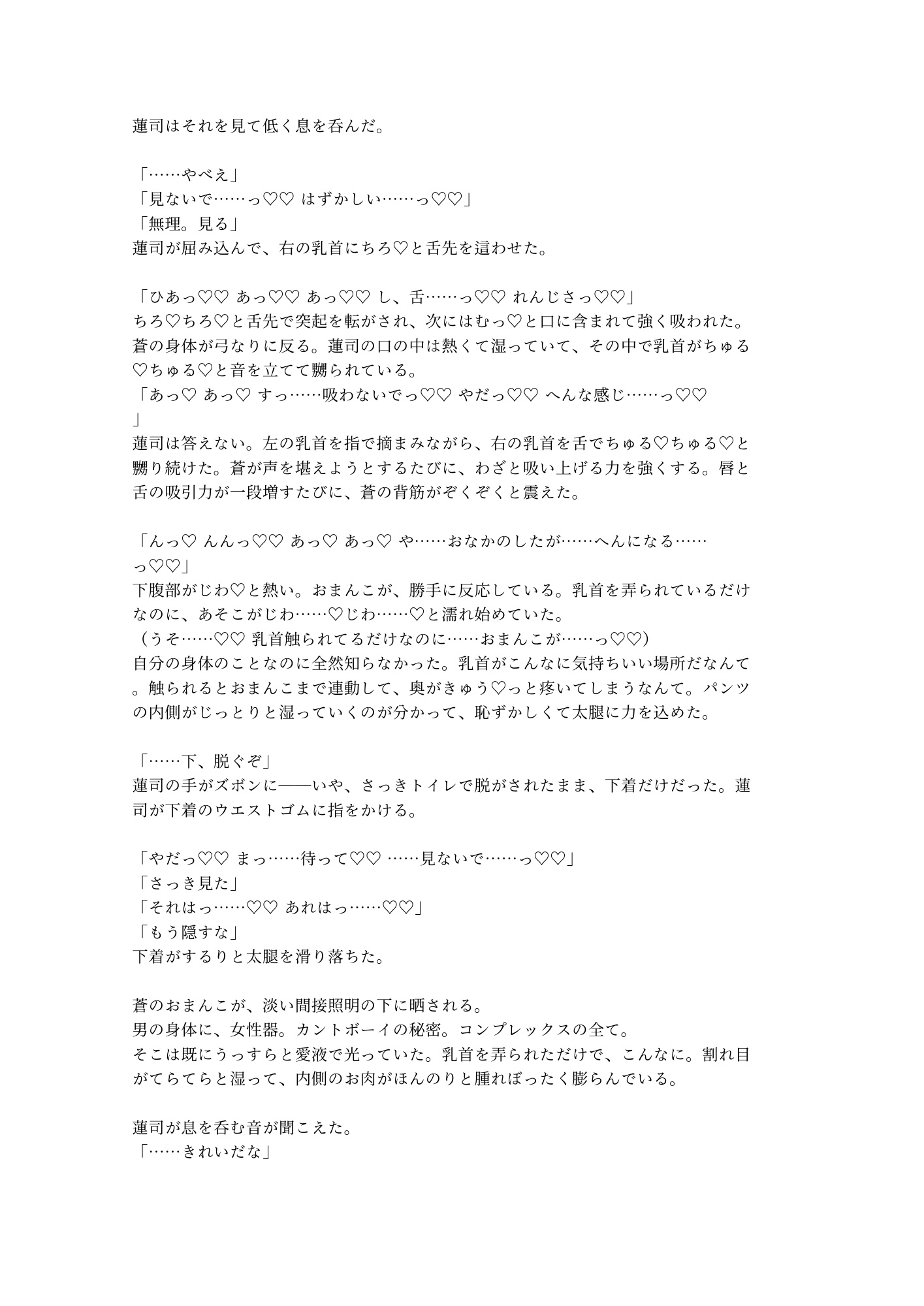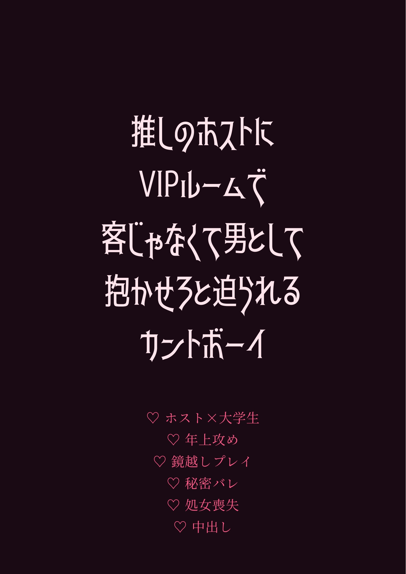 推しのNo.1ホスト・蓮司に通い続ける大学生の蒼には、誰にも言えない秘密があった——男の身体に女性器を持つ”カントボーイ”であること。酔った夜、VIPルームで介抱されるはずが、その秘密を知られてしまう。拒絶を覚悟した蒼に蓮司が告げたのは「客じゃなくて、男として抱かせろ」。コンプレックスごと暴かれ、初めて触れられる身体が甘く蕩けていく——推し×カントボーイの濃密キスから始まる、秘密と快楽のVIPルーム密室BL。