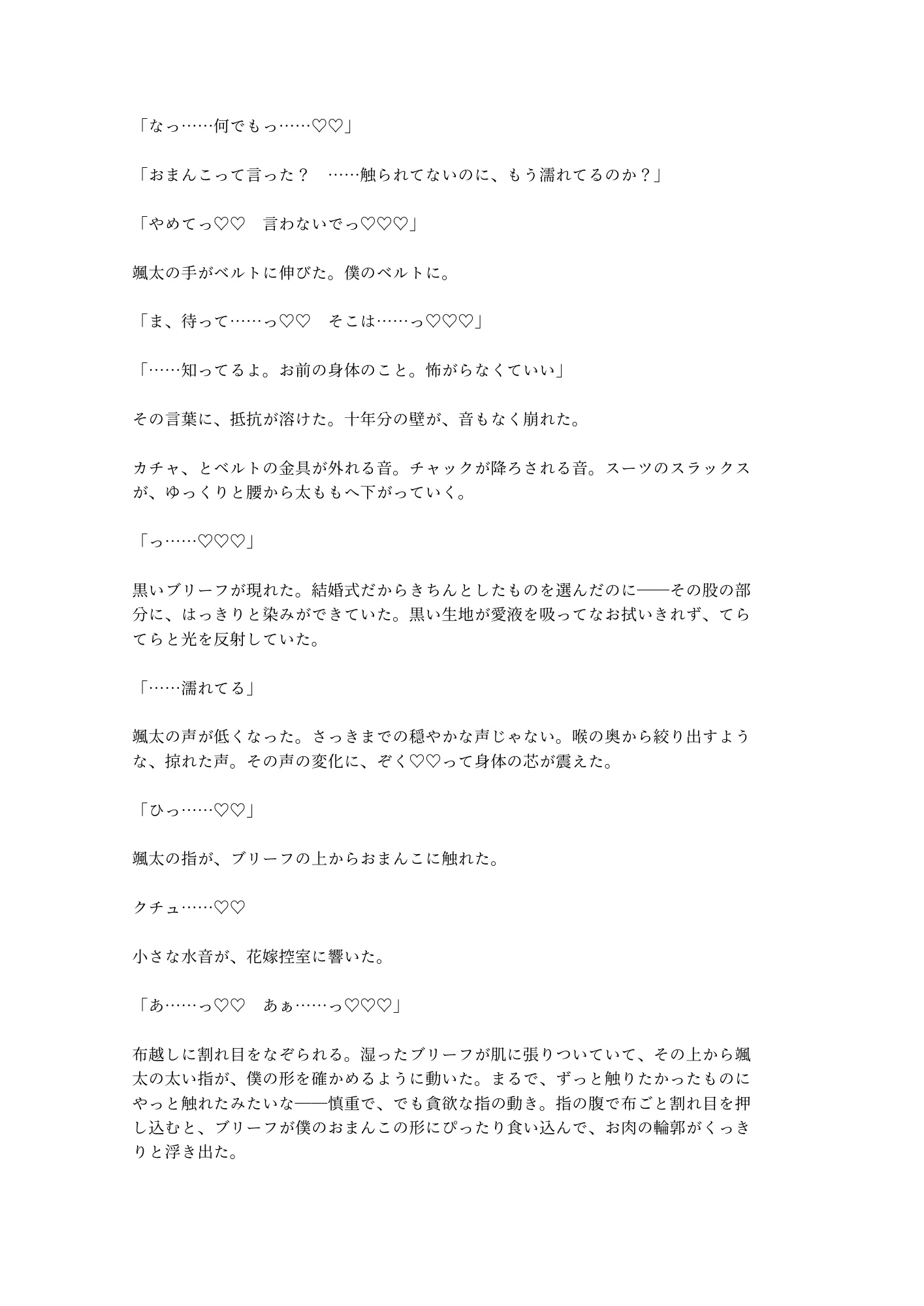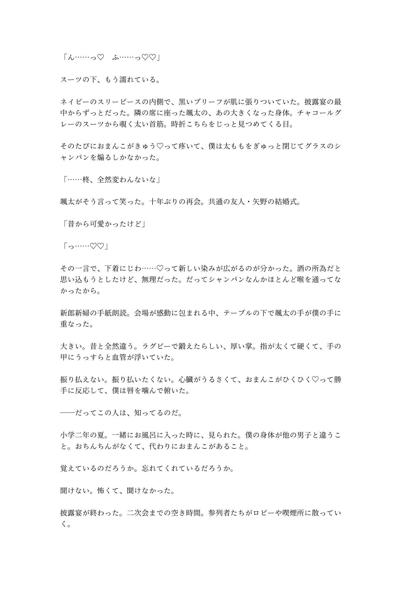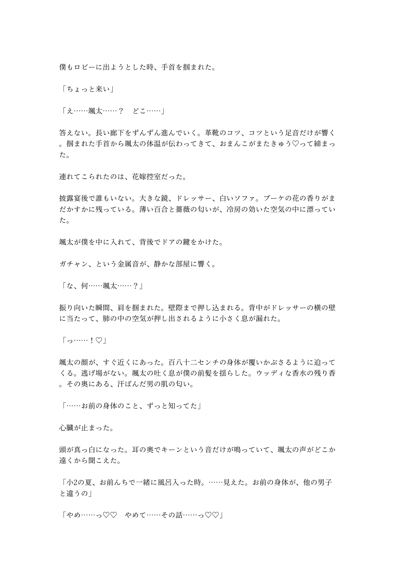 幼馴染の結婚式で十年ぶりに再会した颯太に、花嫁控室へ連れ込まれる——「お前の身体のこと、ずっと知ってた」。◯2の夏に秘密を見られていた。男なのに女性器を持つ身体を、誰にも明かせず二十四年間怯えてきた柊。だが颯太の告白は残酷なほど甘く、ネクタイで手首を縛る指は優しかった。披露宴の喧騒のすぐ向こう側、百合と薔薇が香る密室で、封印してきた身体が初めて暴かれる。