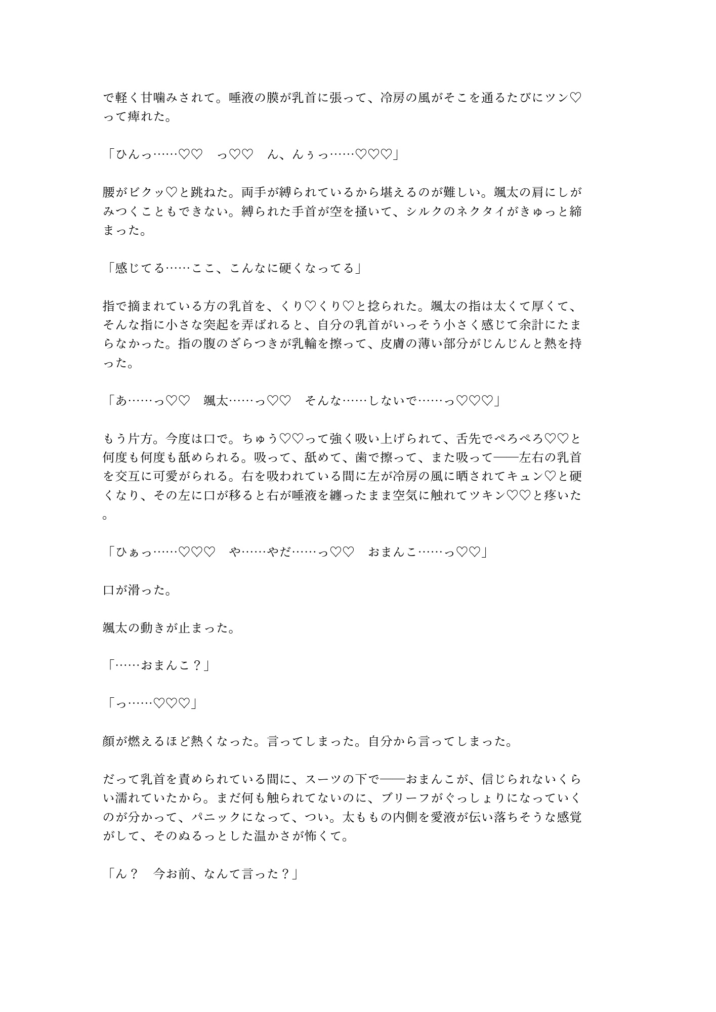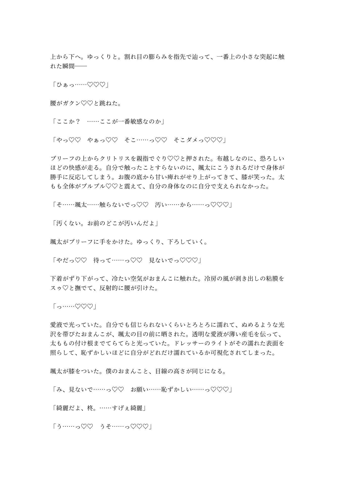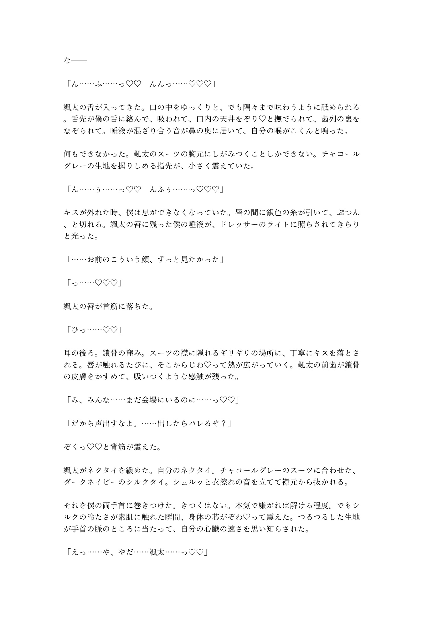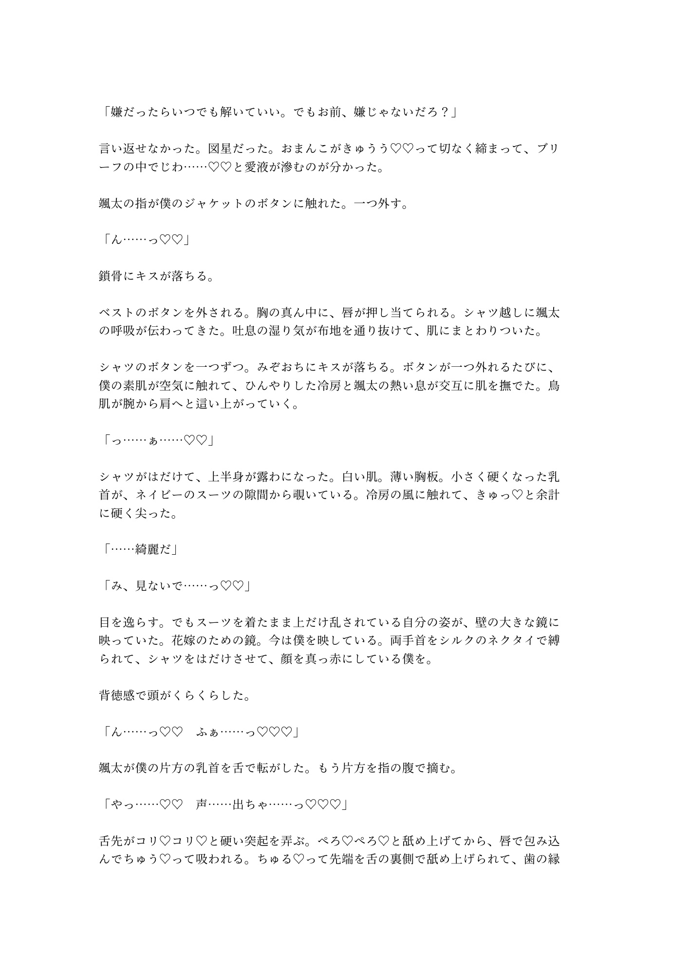 幼馴染の結婚式で十年ぶりに再会した颯太に、花嫁控室へ連れ込まれる——「お前の身体のこと、ずっと知ってた」。◯2の夏に秘密を見られていた。男なのに女性器を持つ身体を、誰にも明かせず二十四年間怯えてきた柊。だが颯太の告白は残酷なほど甘く、ネクタイで手首を縛る指は優しかった。披露宴の喧騒のすぐ向こう側、百合と薔薇が香る密室で、封印してきた身体が初めて暴かれる。