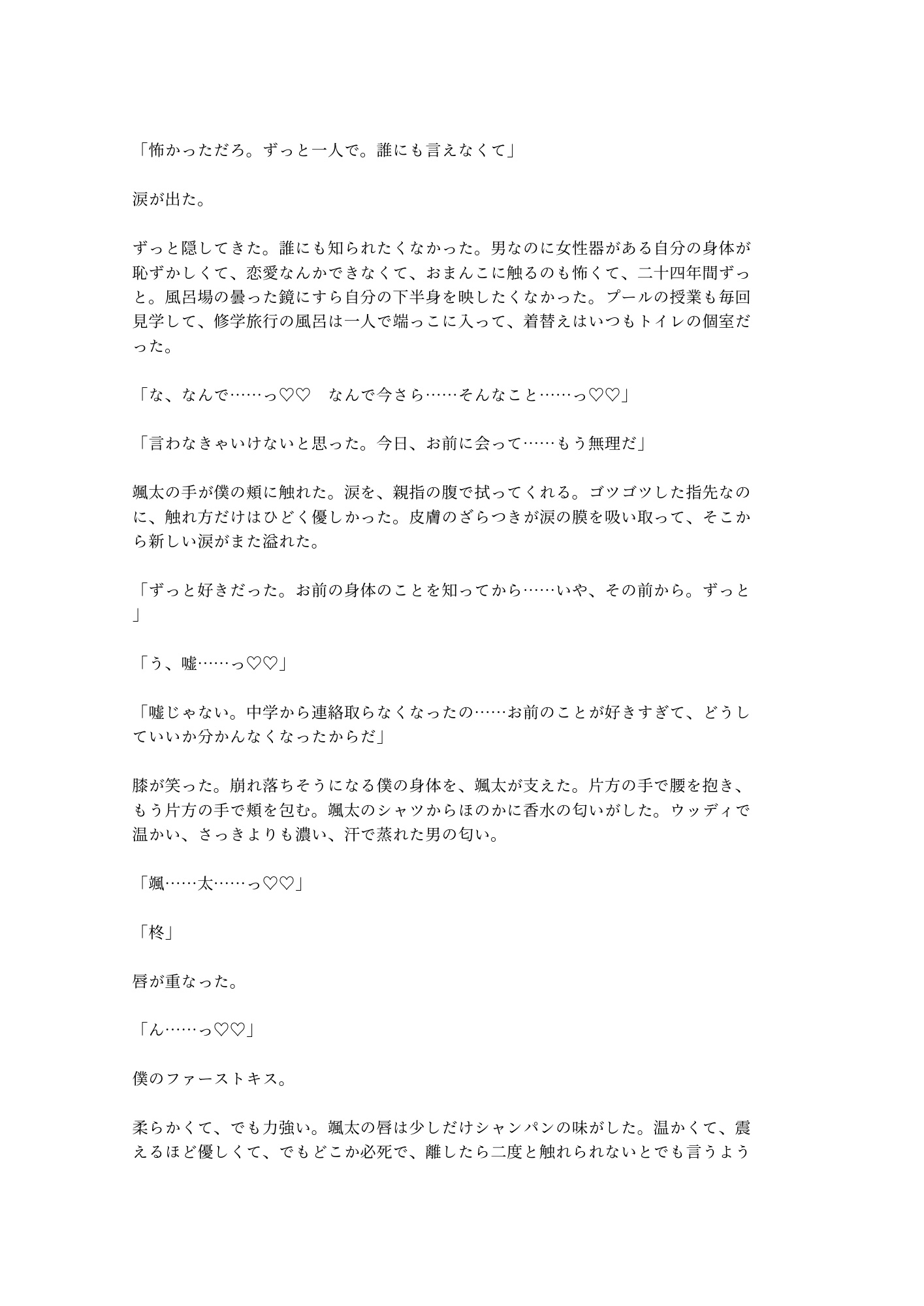 男性の身体に女性器を持つ"カントボーイ"の柊は、誰にも自分の秘密を明かせないまま二十四年を生きてきた。プールも修学旅行の風呂も避け、着替えはいつもトイレの個室。恋愛なんて、できるはずがなかった。