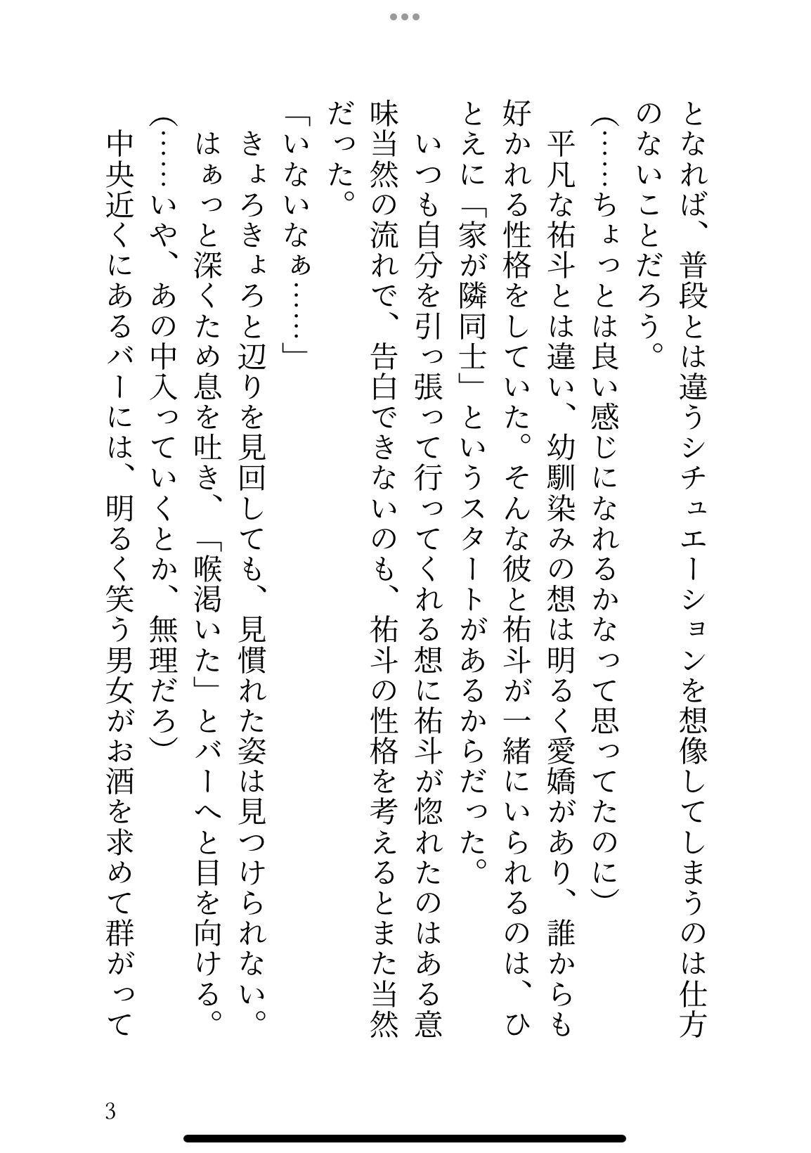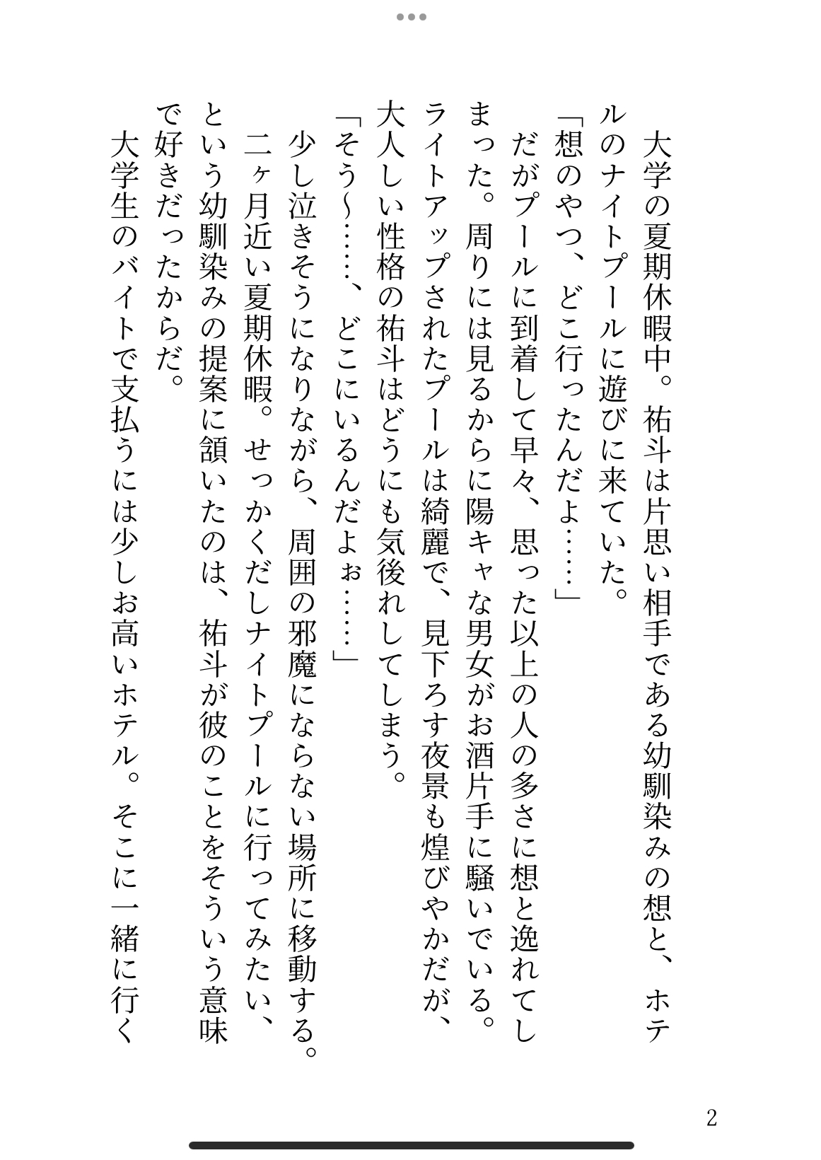 ナイトプールにやってきた祐斗だが、早々に片思い相手の幼馴染と逸れてしまう。ノリのいい客たちから離れながら幼馴染を探すも、なかなか見つからない。