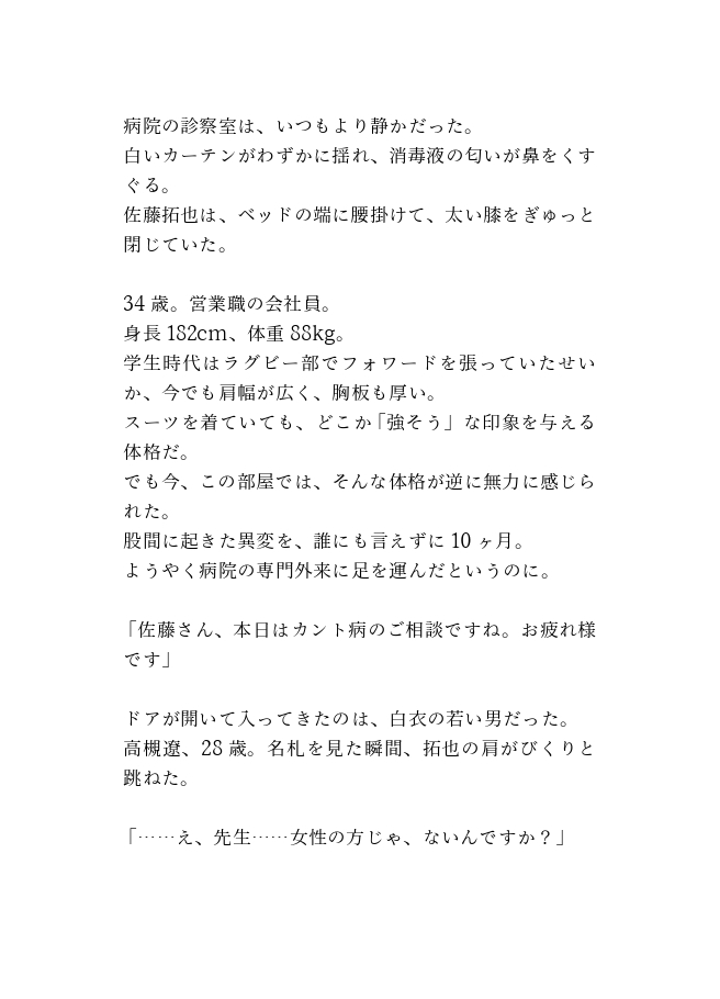 年下のイケメン医師・高槻に診察された瞬間から、拓也の身体は裏切り始めた。 元ラガーマンの強靭な体格とは裏腹に、できたばかりのカントは敏感すぎて……年上なのに年下に支配され、愛され、満たされるカントボーイの甘々堕ち物語。