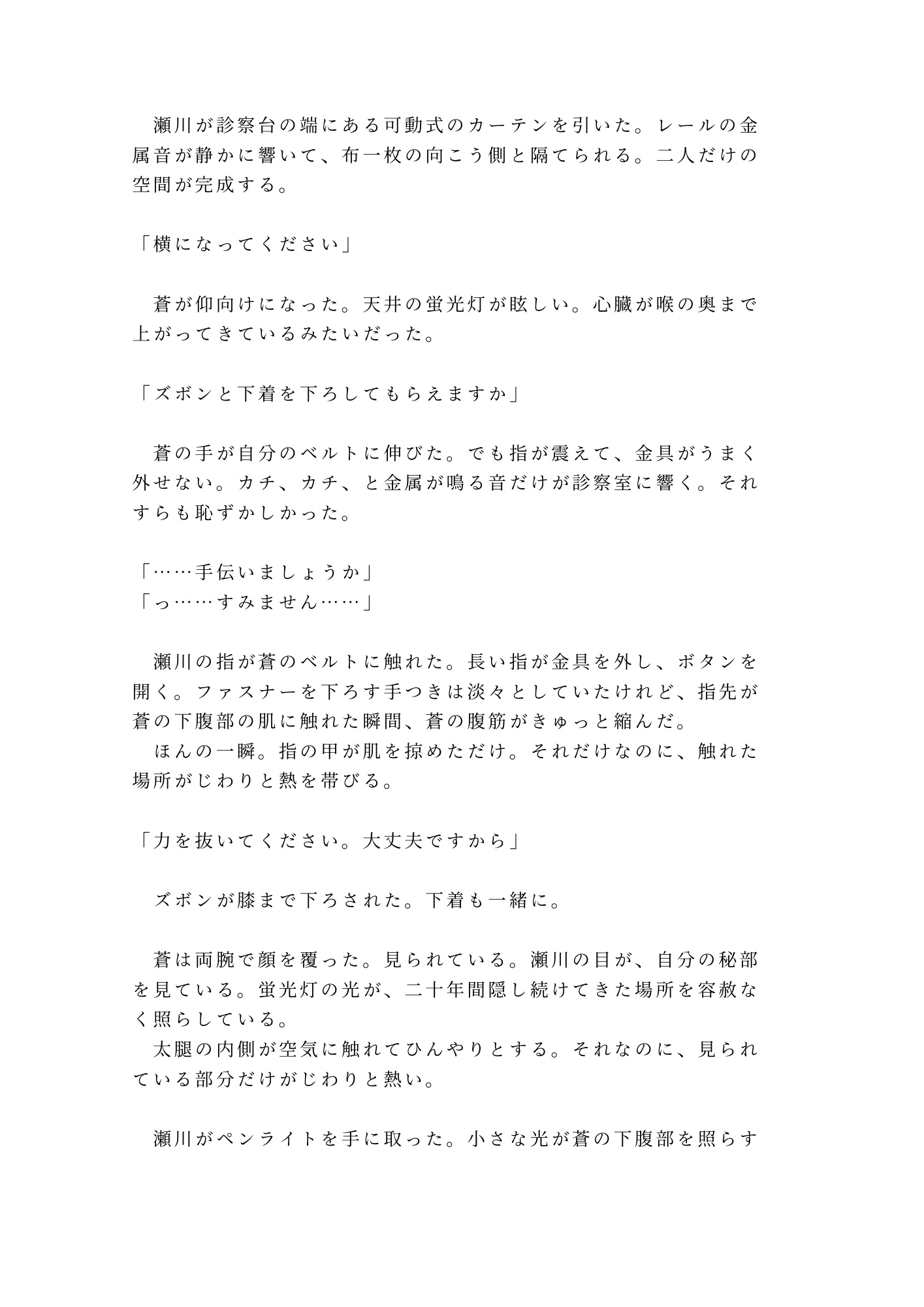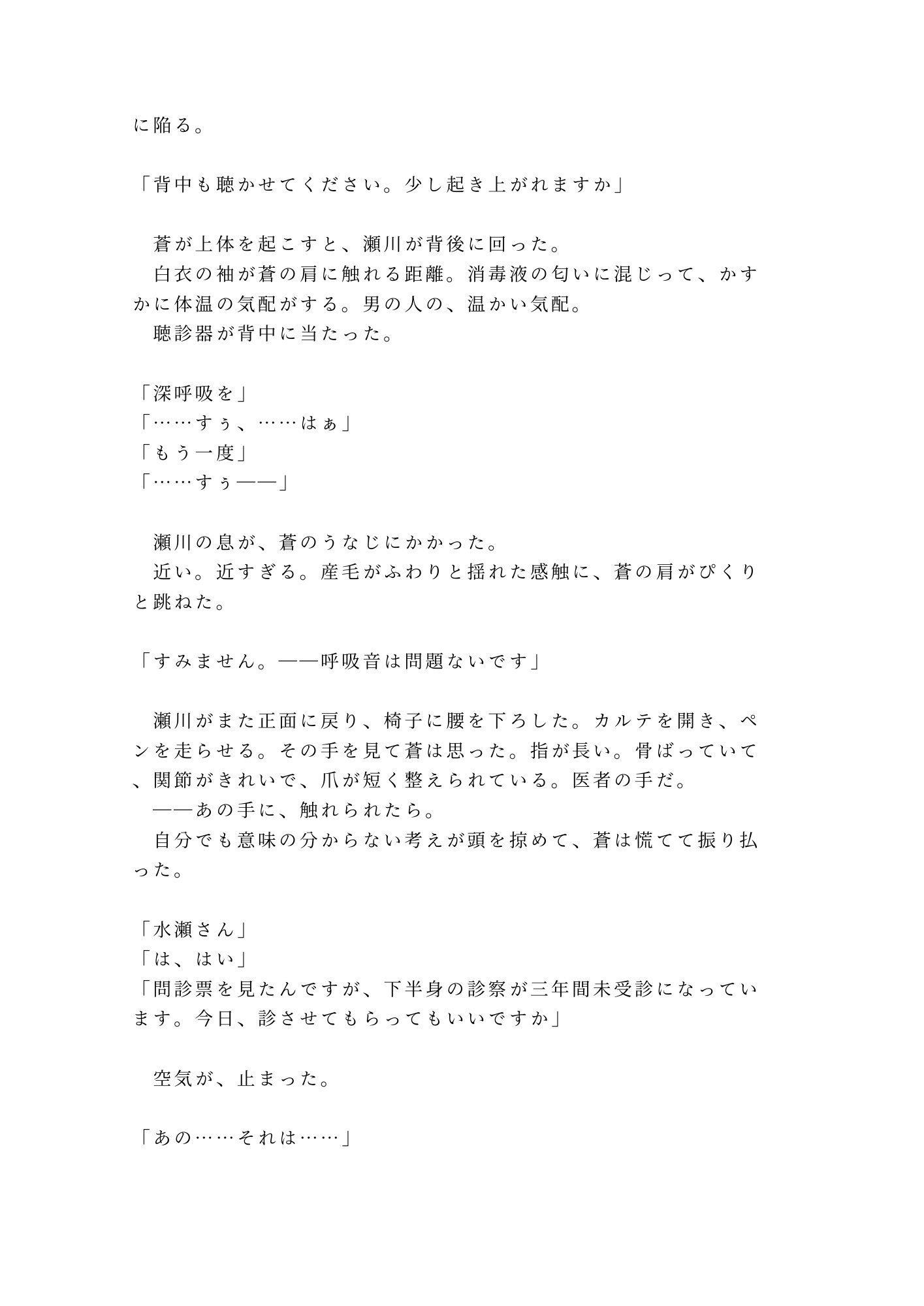 触れてはいけない患者の体。触れられたいと願い始める体。自分の体に触れることすら拒んできた蒼が、瀬川の指だけを求めてしまう背徳と切なさ。診察室という密室で、医師と患者の一線はどこまで保てるのか。