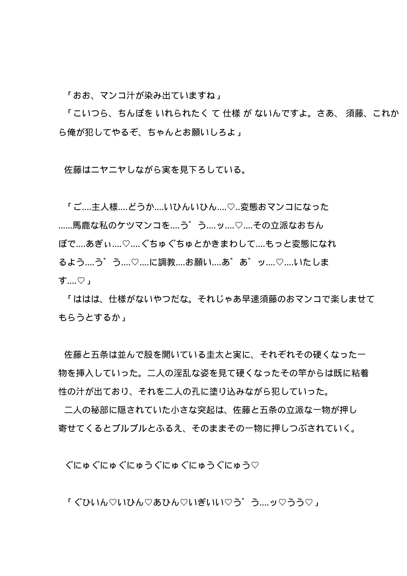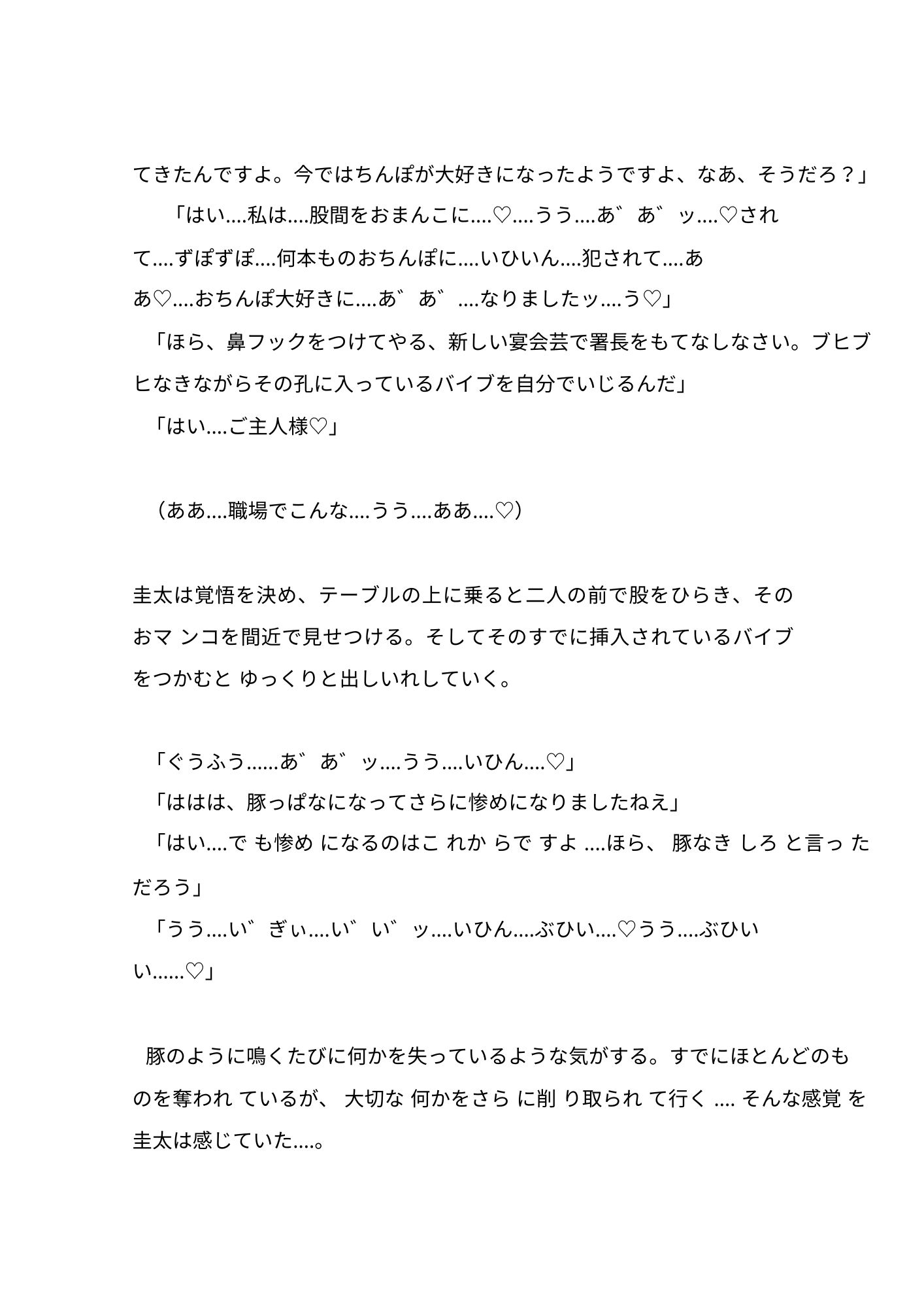 ノンケ警察官(カントボーイ化) × カントボーイ専門調教販売師 。18禁小説です。 変態露出狂のカントボーイ(女性器をもつ男性)を捕まえた警察官八雲圭太が、その変態露出狂の主人である五条剛にカントボーイ化ウィルスを打たれて、代わりの奴○、販売用の商品にされていく。 2では圭太の同期や父親も登場します‥‥。 ディルド責め、同期や父の前での羞恥、水責め、ベルト打ち、犬扱い、豚扱い、豚鳴き、露出等