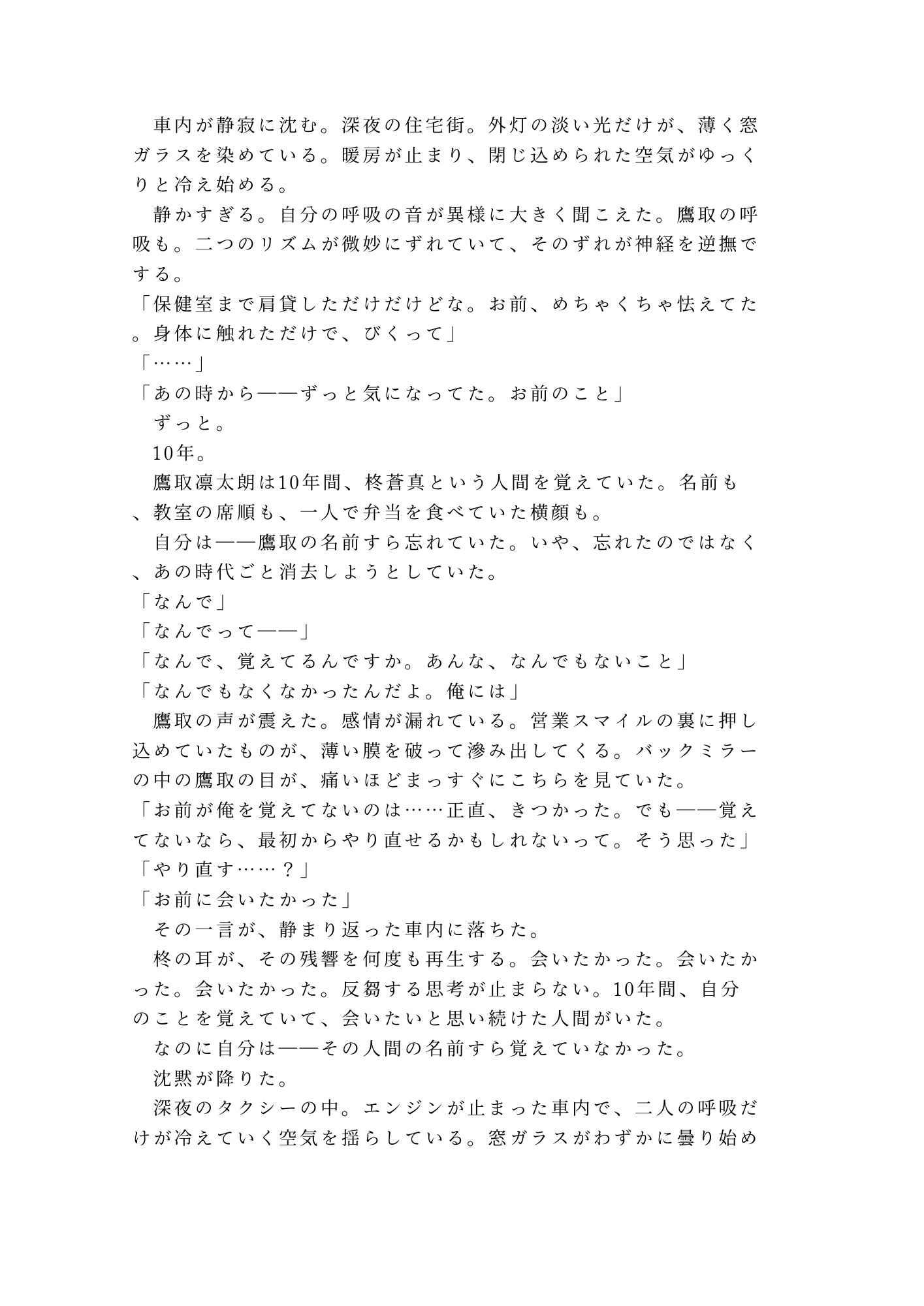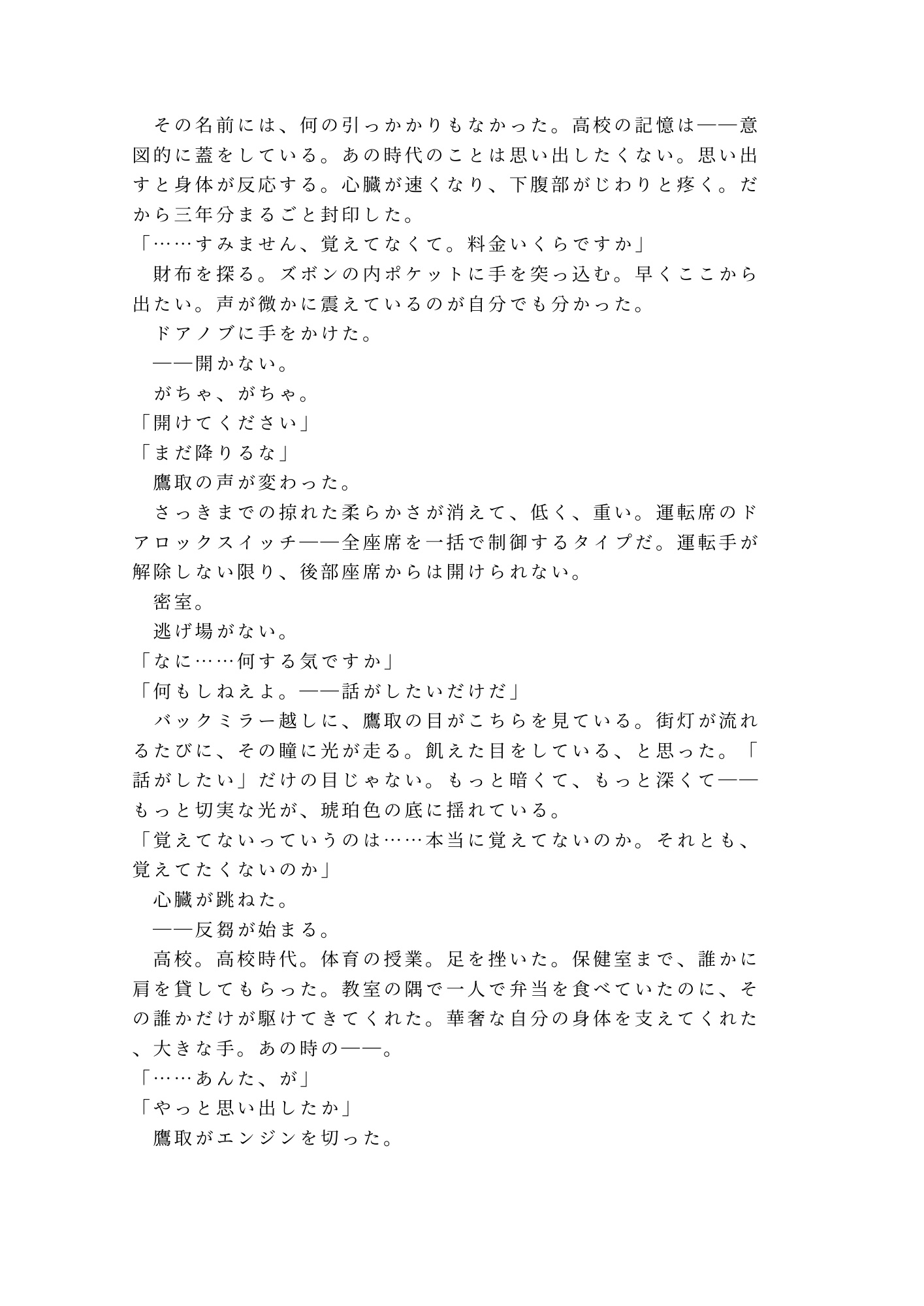 酔い潰れた後部座席で目を覚ました柊蒼真を待っていたのは、高校時代の元同級生・鷹取凛太朗。10年間、たった一度肩を貸しただけの相手をずっと忘れられなかった男。目的地に着いてもドアロックは解除されない。「逃がさない」——その低い声が、封印していたはずの記憶と身体を、否応なく暴いていく。