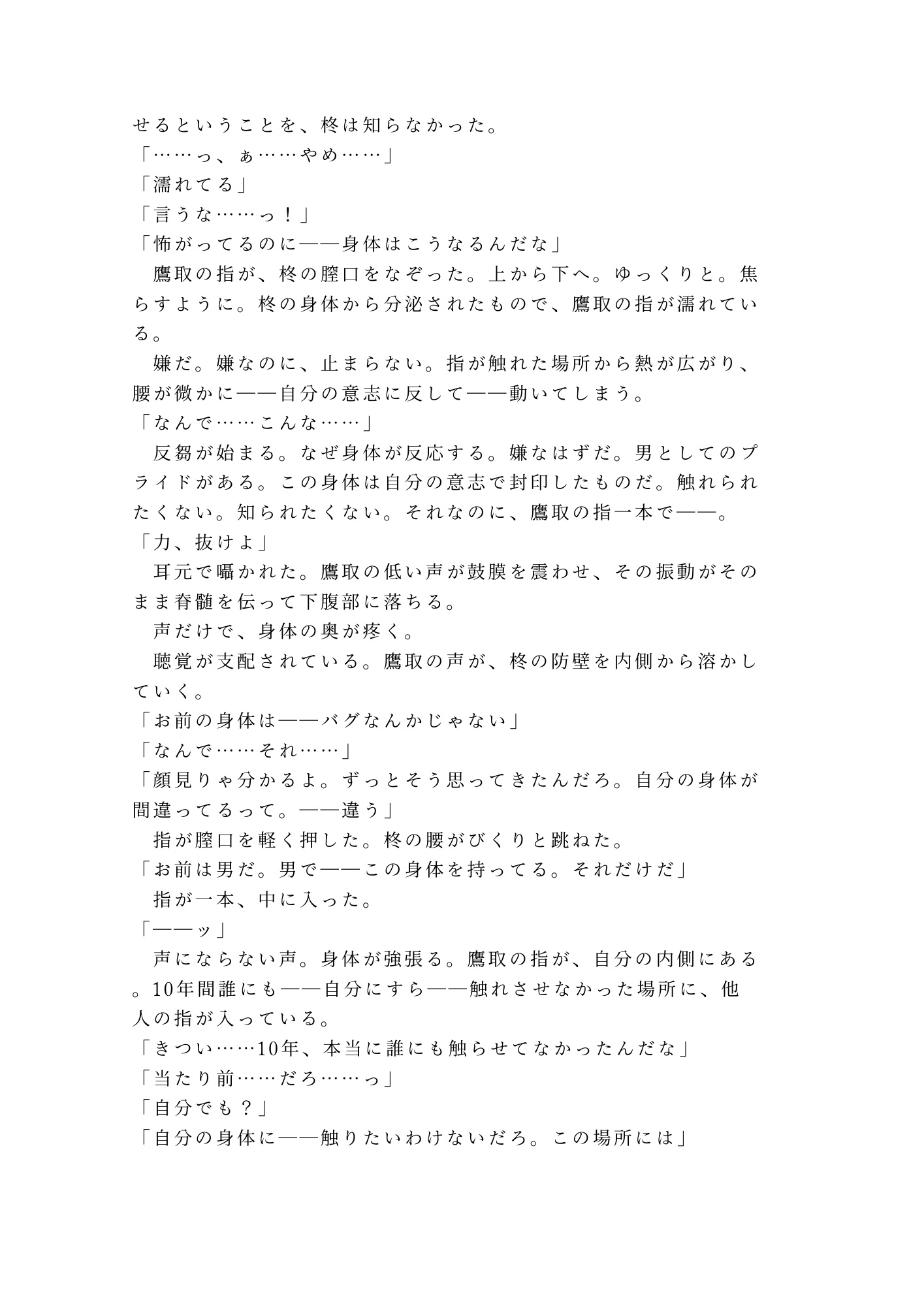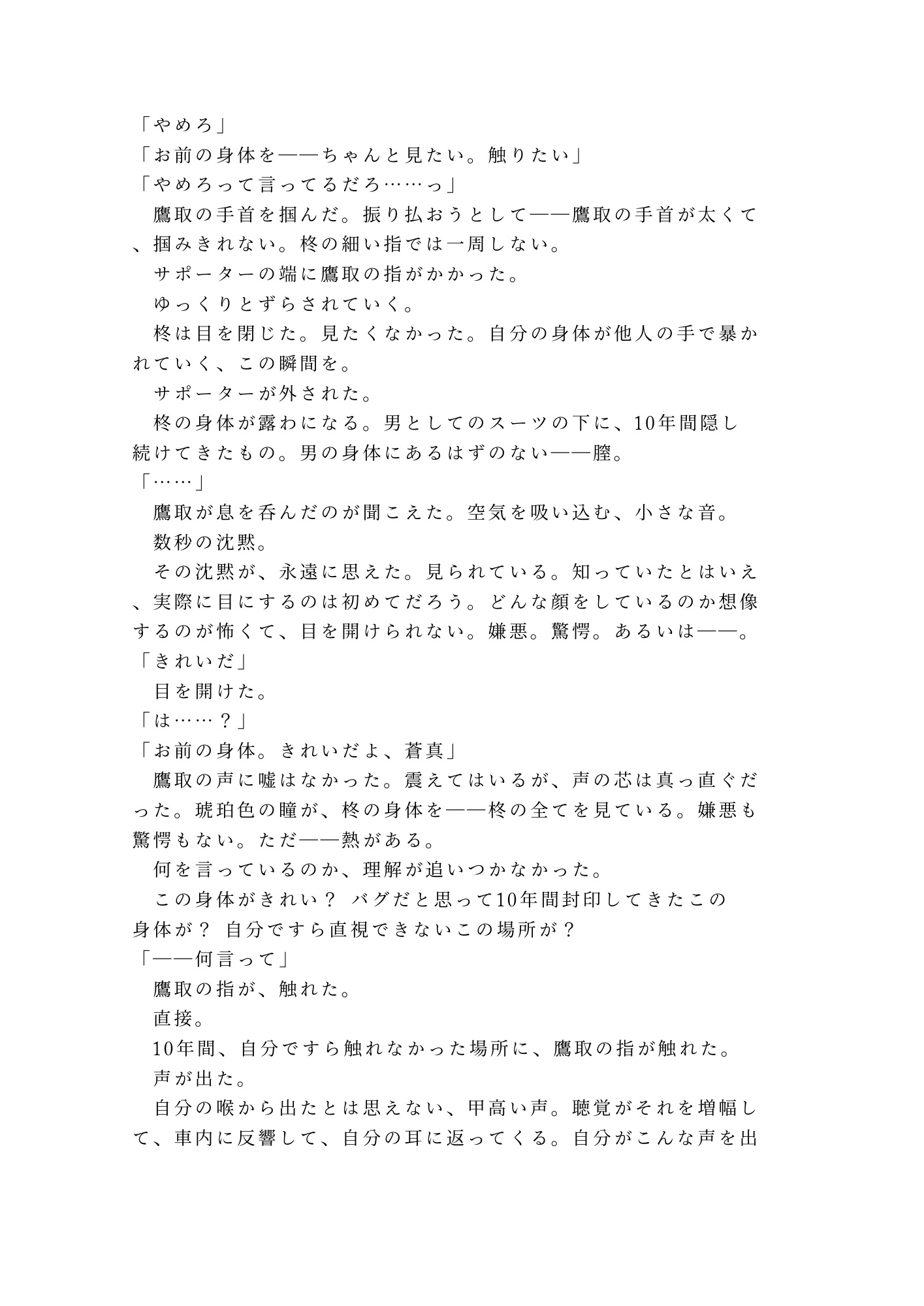 柊蒼真はカントボーイ。男として生きながら、誰にも明かせない身体の秘密を抱えて生きてきた。高校時代ごと記憶に蓋をして、自分の身体に触れることすら避けてきた10年間。一方の鷹取は、あの日肩を貸した瞬間に「気づいていた」。気づいた上で、黙っていた。誰にも言わなかった。その沈黙は優しさだったのか、それとも執着の始まりだったのか。