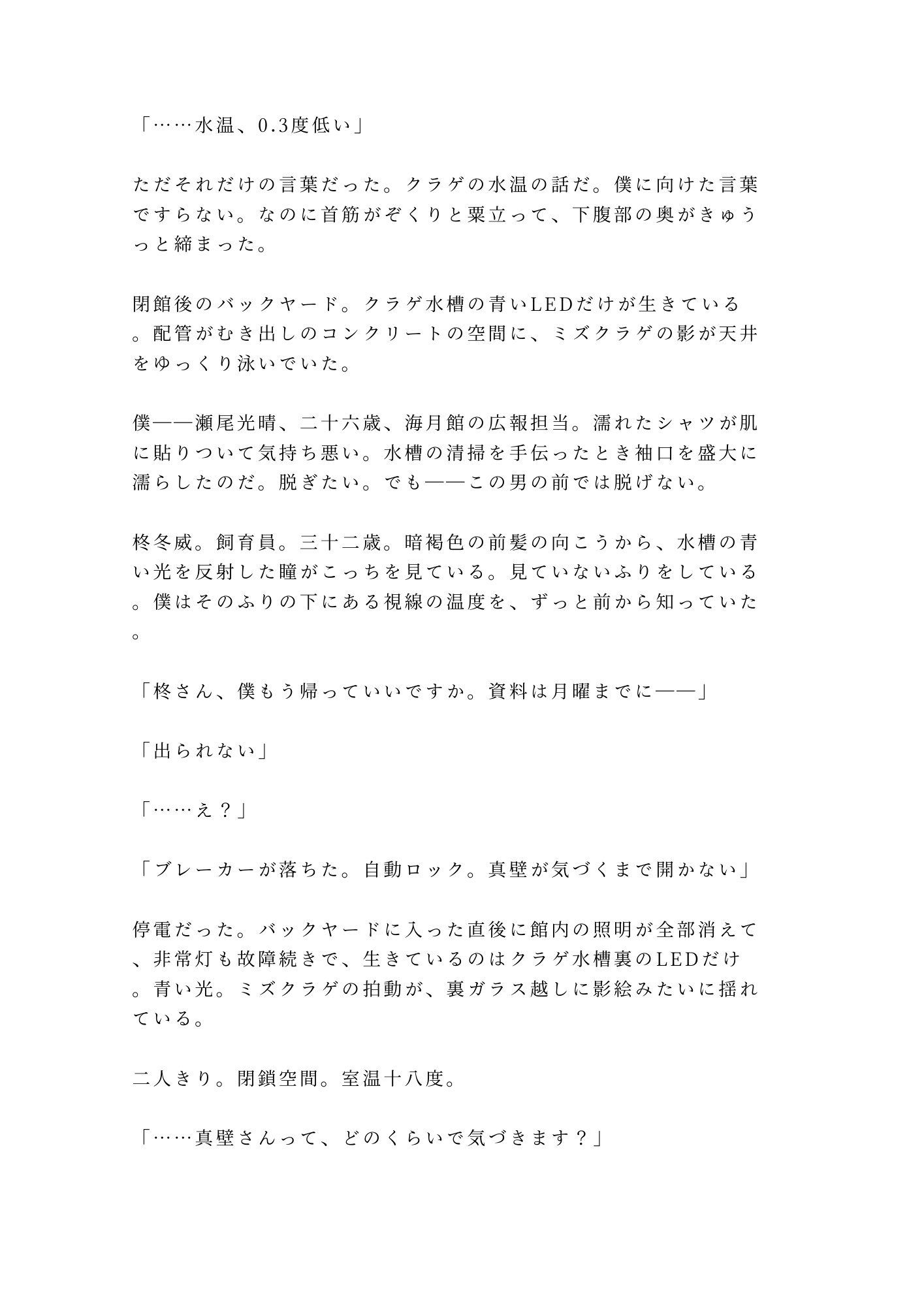 閉館後の水族館——停電で閉じ込められた二人きりの密室。クラゲ水槽のLEDだけが灯る青い闇の中で、広報担当の瀬尾光晴は、ずっと隠してきた秘密を無口な飼育員・柊冬威に暴かれていく。