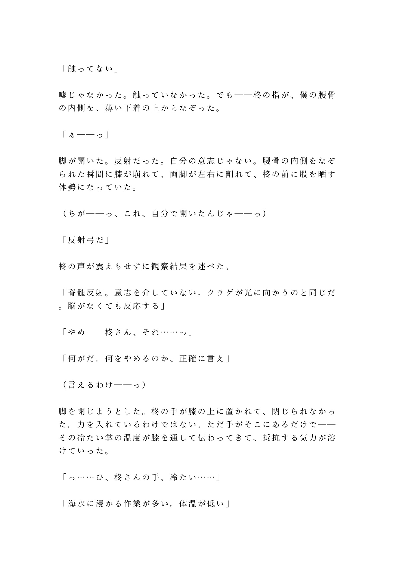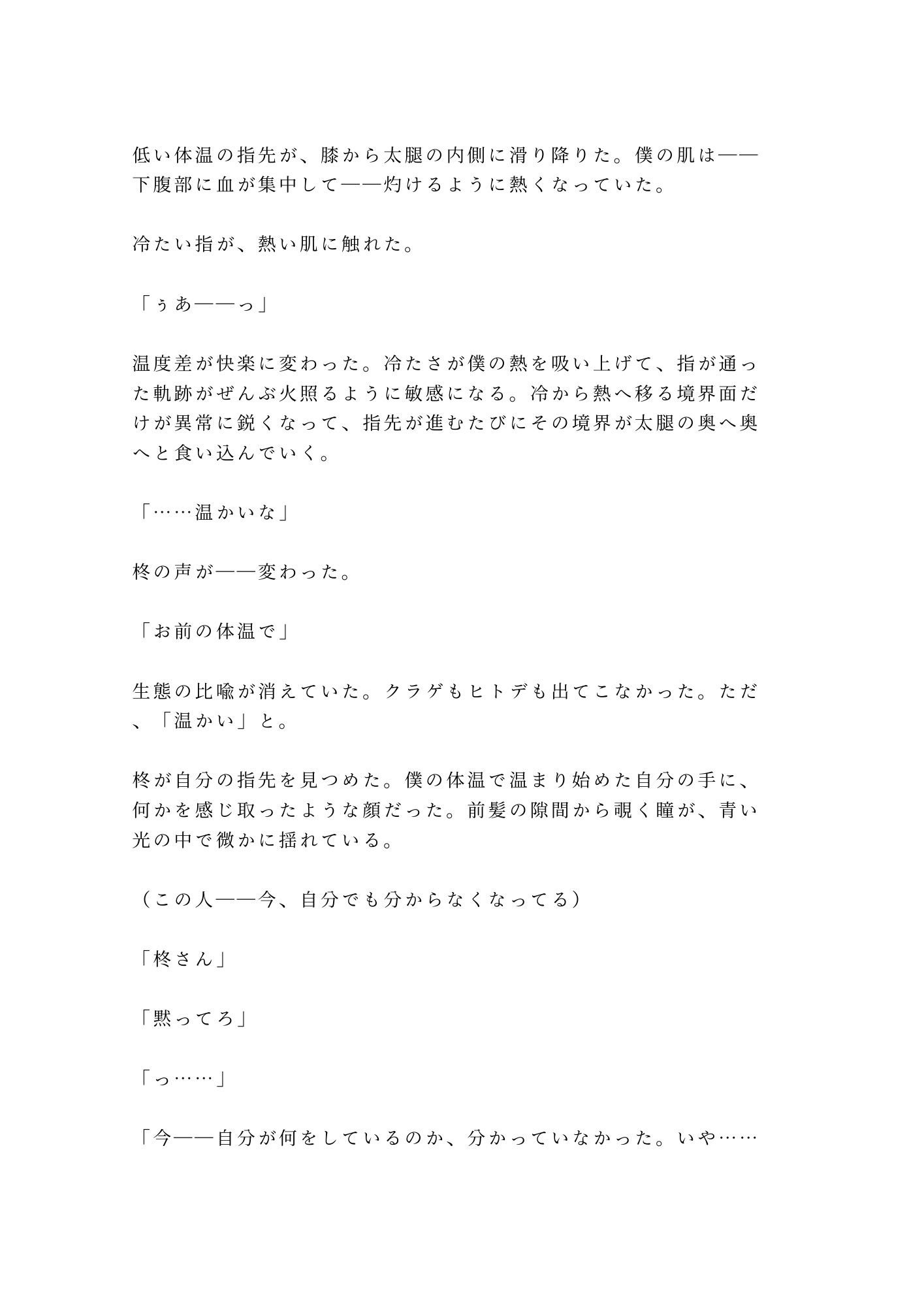 光晴は誰にも見せたことのない身体を持つカントボーイ。「異常なし」という診断が逆に彼を孤独にしてきた。けれど冬威は違った。同情も嫌悪もなく、ただ「個体差だ」と言い切る。何百何千の海洋生物を見つめてきた男の、静かで確かな目。その視線に、光晴の二十六年間の鎧が音もなく剥がれていく。