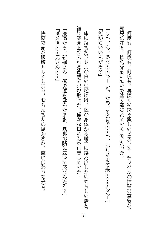 夫と愛を誓ったその場所で、義兄の熱い種がドチュドチュと注ぎ込まれる。幸せという名の仮面の下で、義兄から身体の芯まで快楽を叩きこまれ、自分でも気づかないうちに彼を求めてしまっていた。