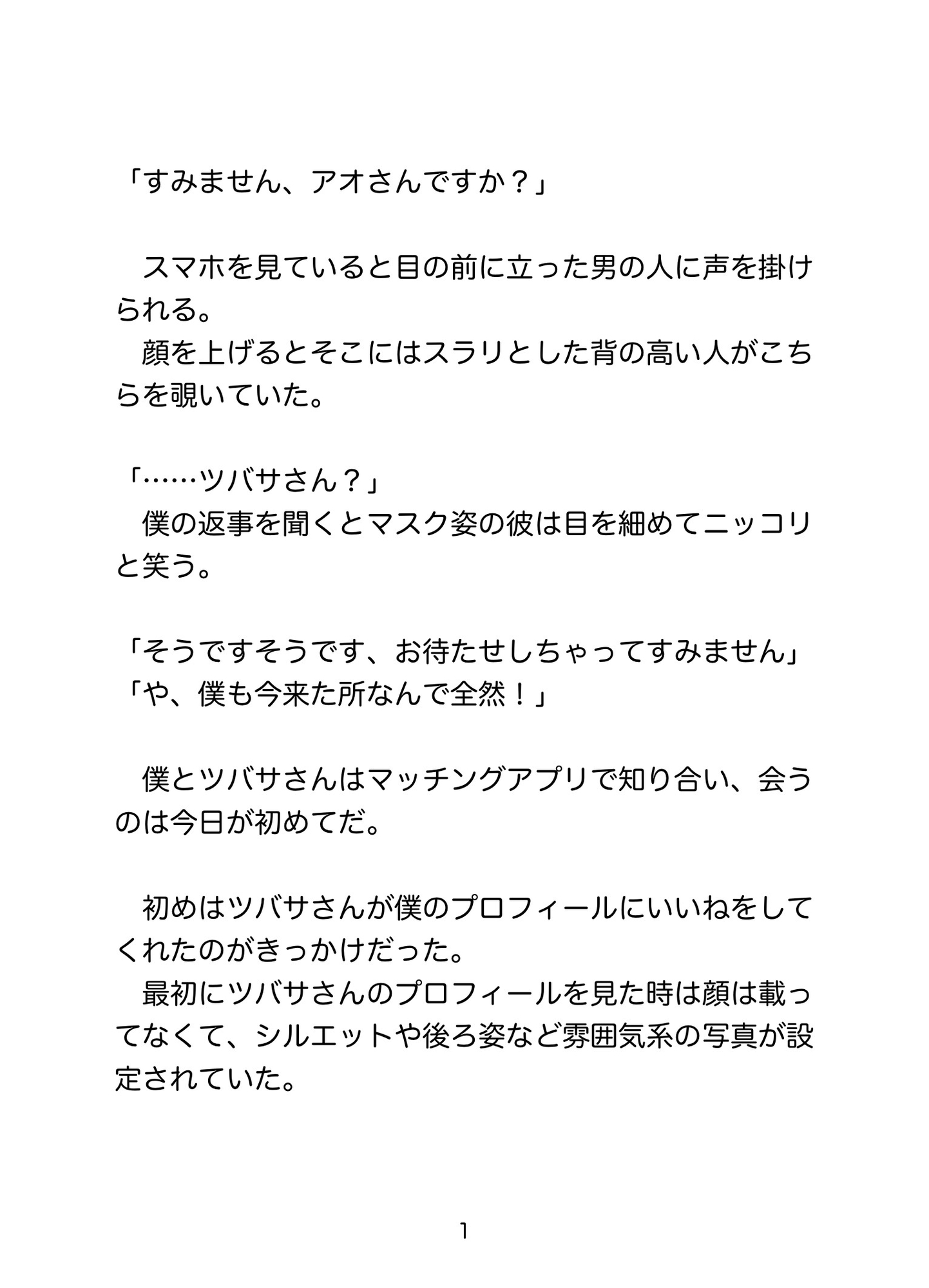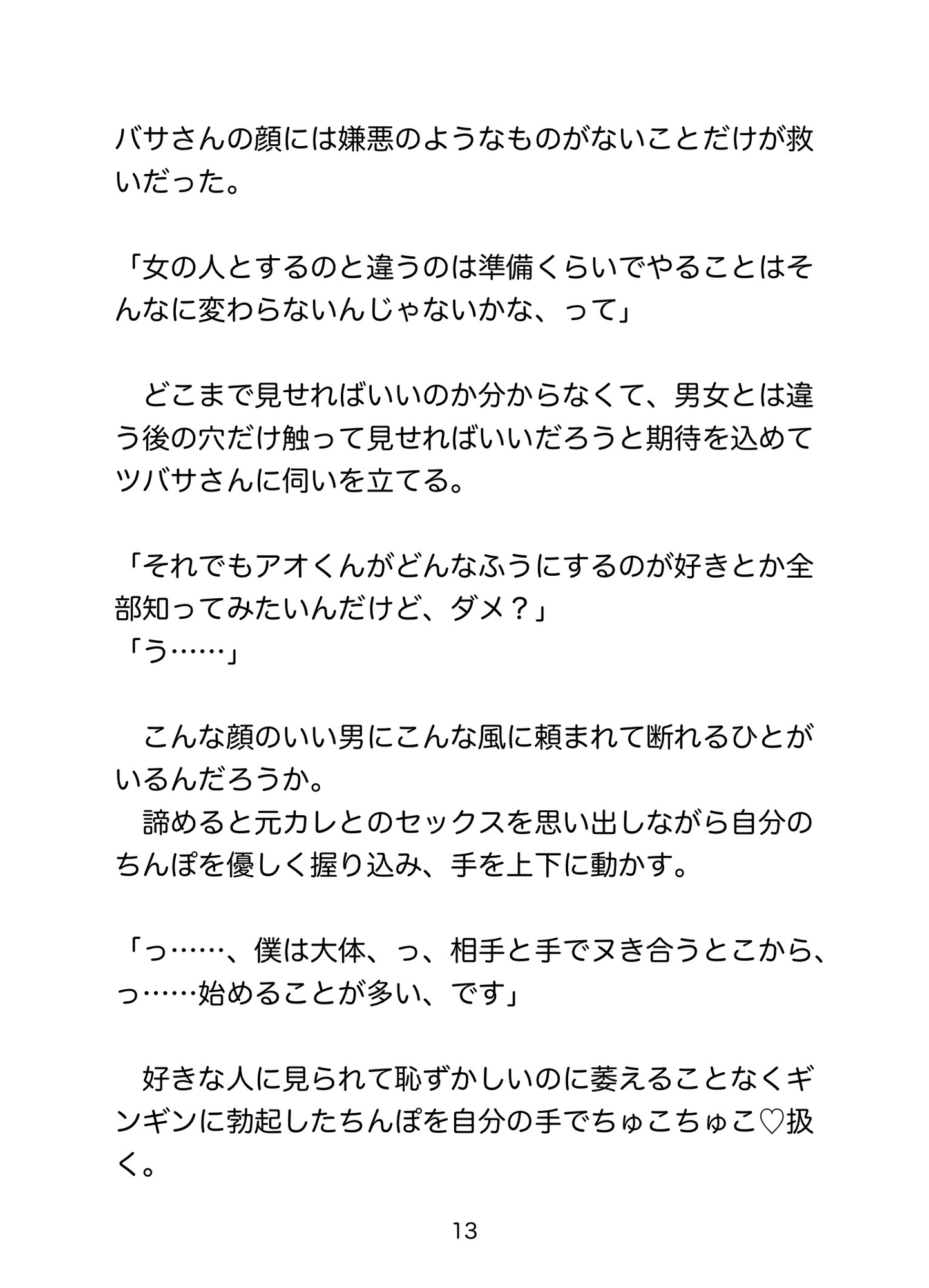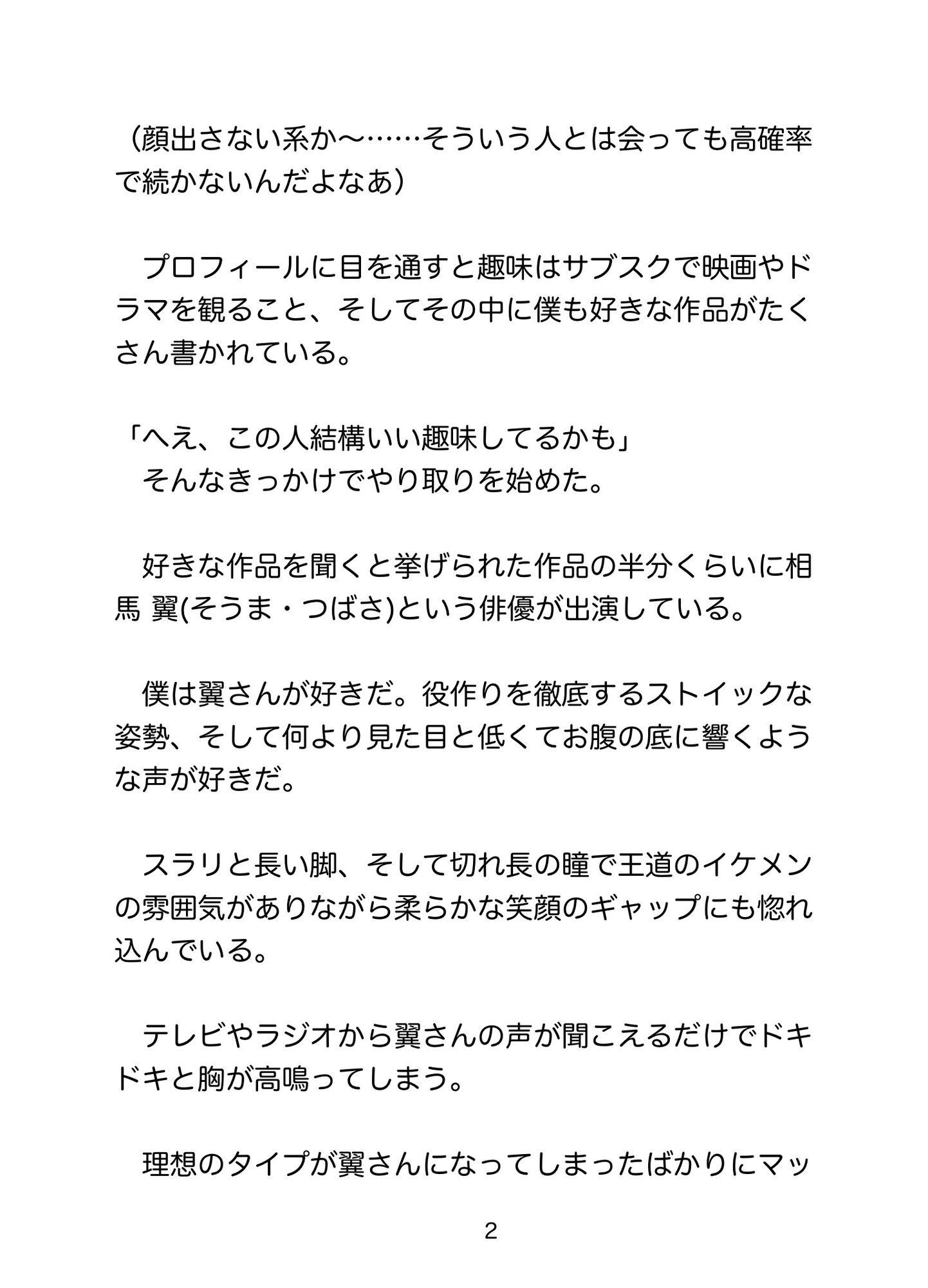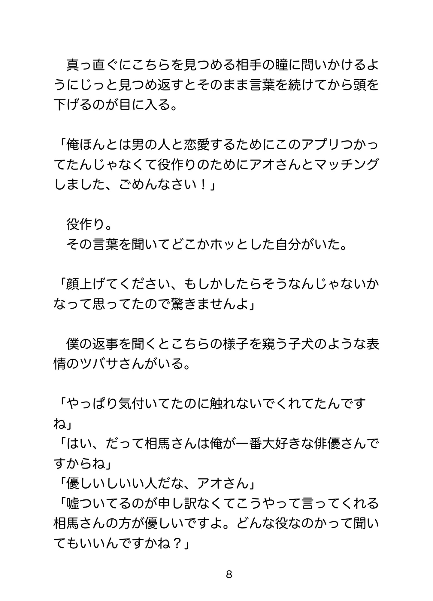 マッチングアプリで出会った男の人が自分のいちばん大好きな推し俳優でした。同性愛をモチーフにした作品の役作りのために男の子同士はどうやってセックスをするのか教えて欲しいと頼まれてオナニーから始めると乳首をこりこり♡されたり、興奮して勃起してくれた推しのち〇ぽをしゃぶって気持ちよくしたりしているうちに挿入されてセックスをしてしまう話です。