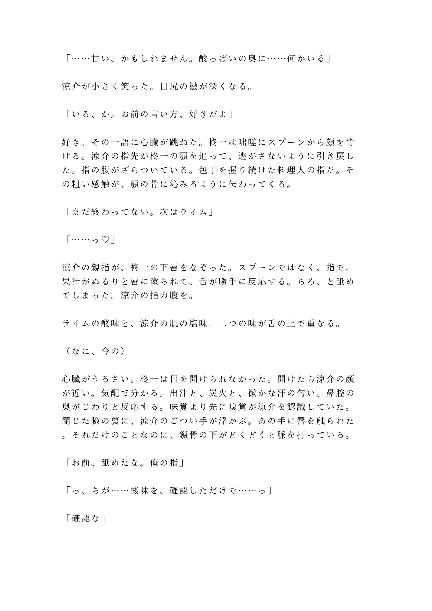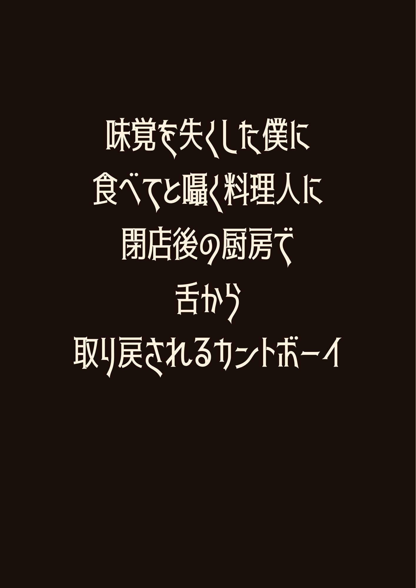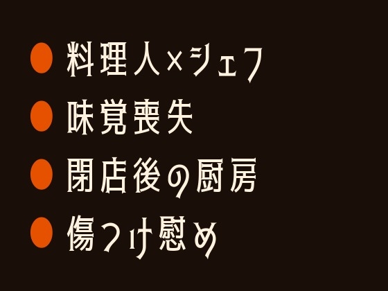 味覚を失った元料理人の柊一と、閉店後の厨房で”味覚のリハビリ”を施す料理人・涼介。酸味のグラデーションから始まる官能的な味見は、やがてスプーンから指へ、指から唇へと距離を縮めていく。「次はもっと近くでやる」——舌で味を取り戻すたび、封じていた身体の感覚も甘く疼き出す。傷ついた心と舌を、一口ずつ愛で塗り替える閉店後の厨房BL。