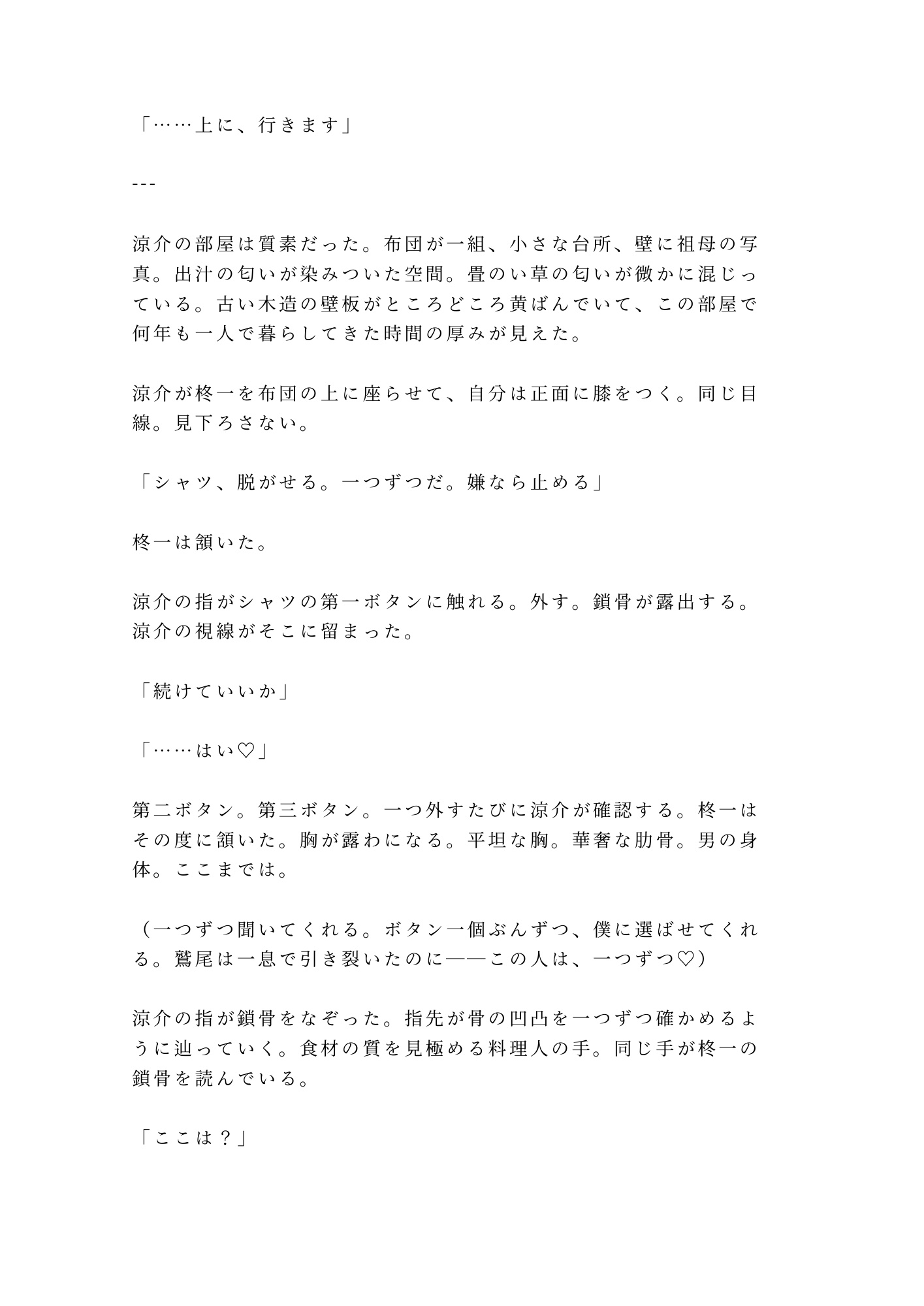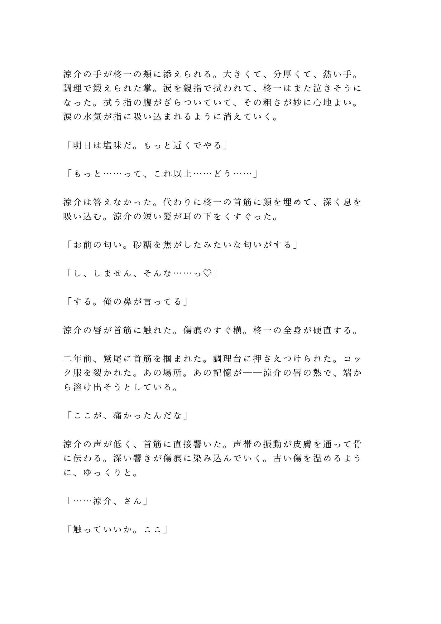 百八十二センチの頑丈な身体に火傷の痕が散る涼介は、包丁を握り続けた荒い指で柊一の涙を拭い、ボタン一つ外すたびに「続けていいか」と聞く男。壊された場所を別の温度で塗り替えていく、不器用で切実な優しさが胸を抉る。