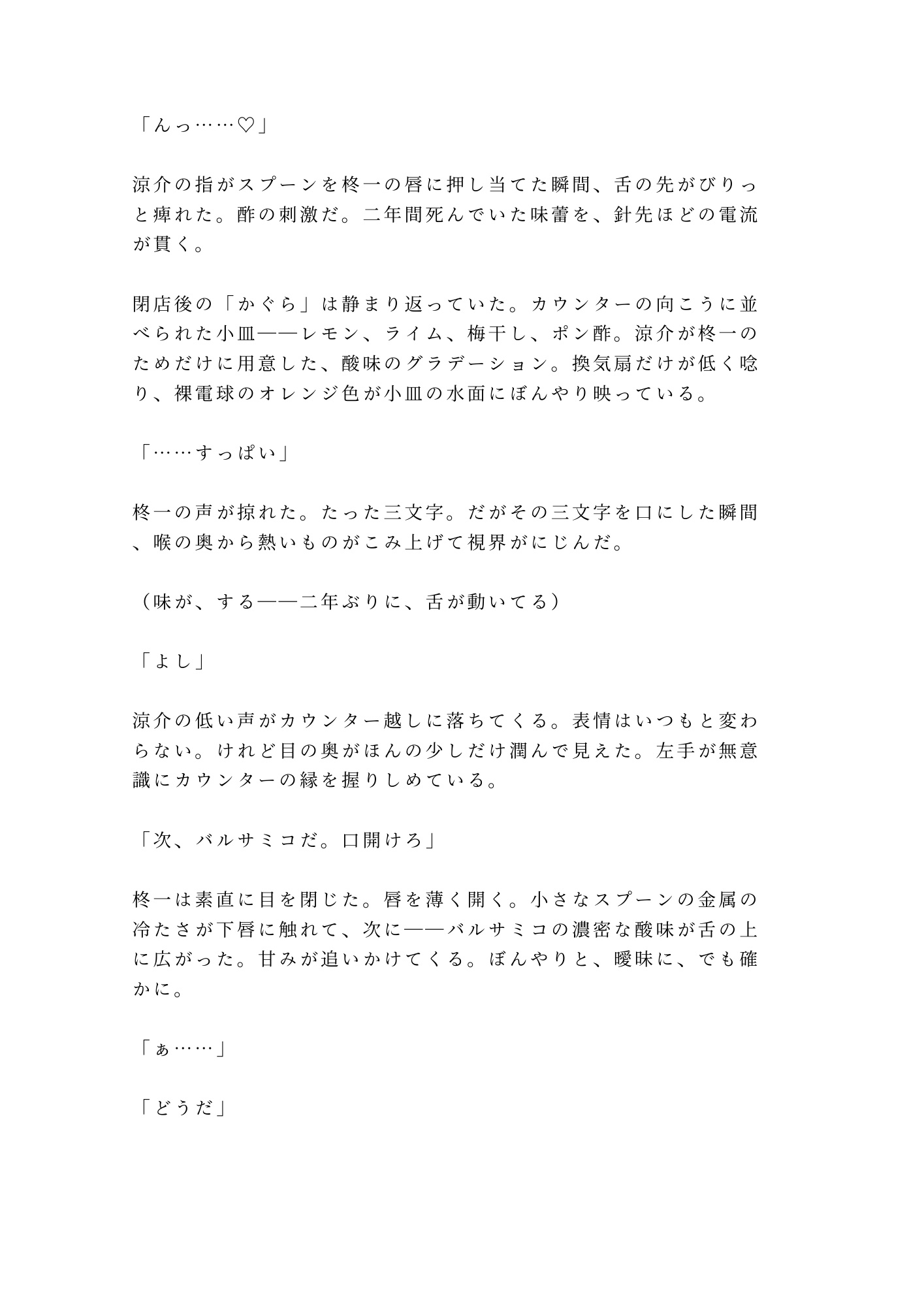 閉店後の小料理屋「かぐら」。カウンターに並ぶのは、レモン、ライム、梅干し、バルサミコ——料理人・涼介が、味覚を失った元料理人・柊一のためだけに用意した酸味のグラデーション。