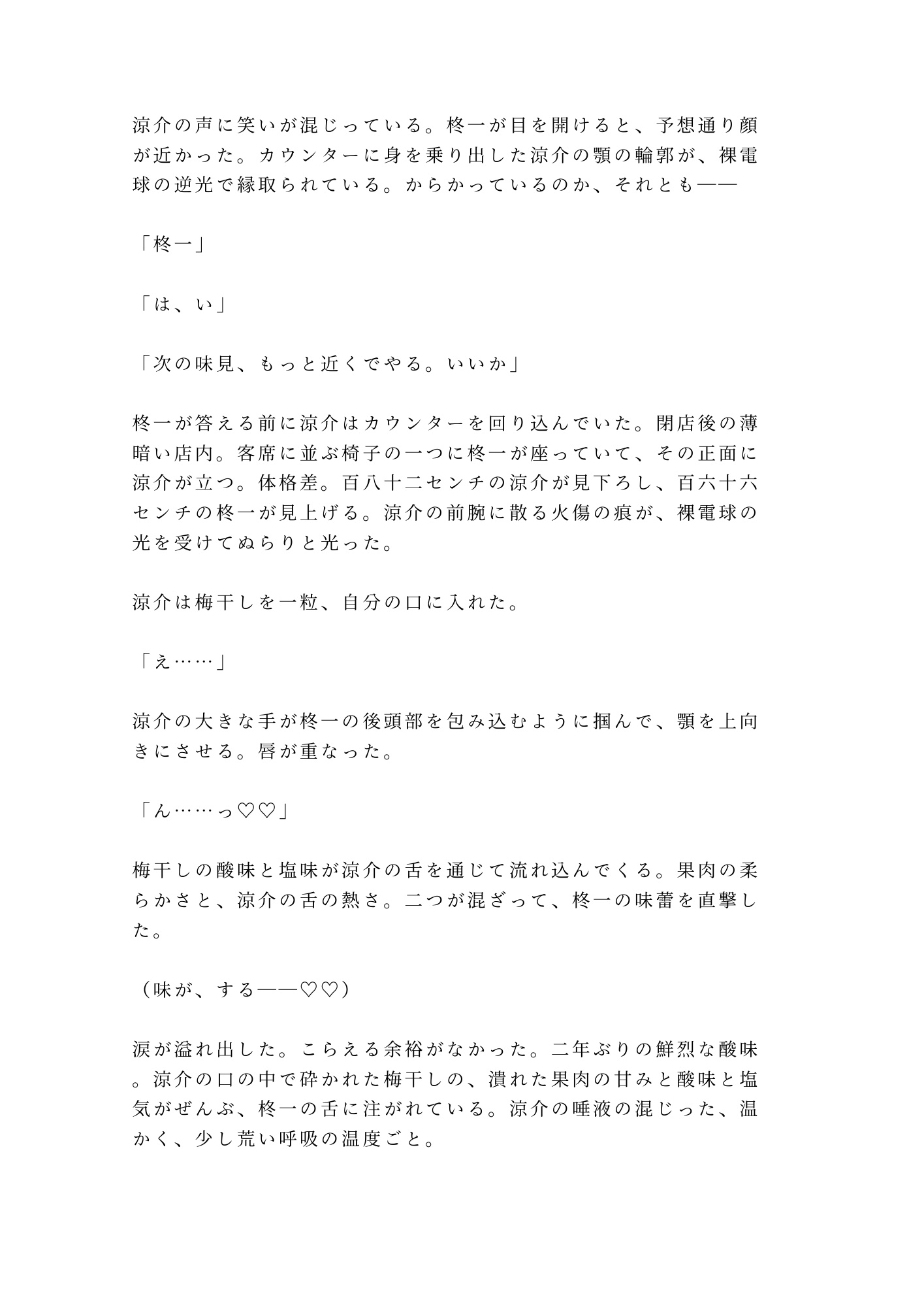 涼介のリハビリは、スプーンから指へ、指から唇へと距離を詰めていく。口移しで届けられる梅干しの酸味と塩味。途中から梅の味なんかしていない——舌が捉えているのは涼介自身の味だけだ。味覚の回復と恋の自覚が、同じ舌の上で同時に始まっていく。