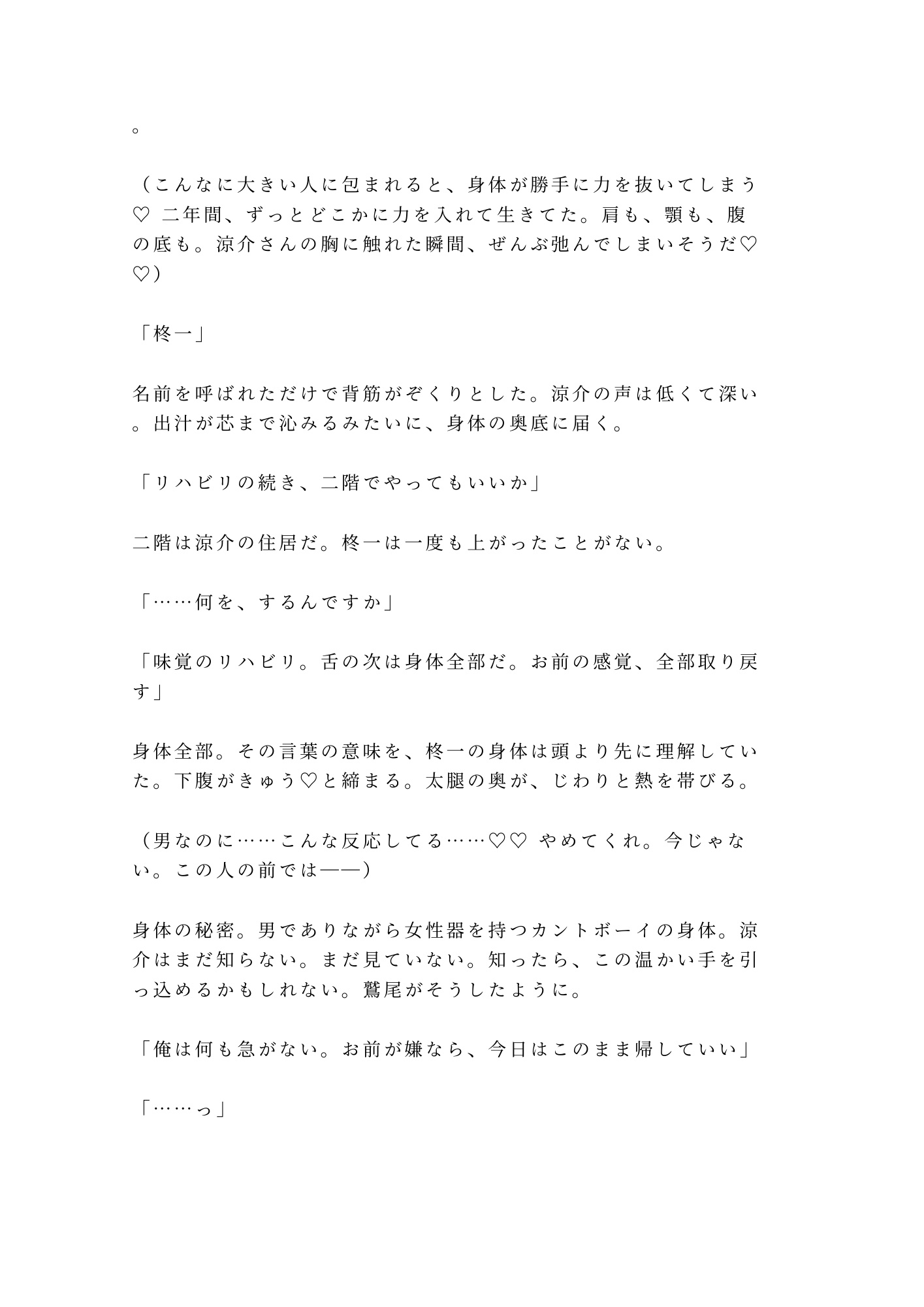 一方の柊一は、男でありながら女性器を持つカントボーイ。誰にも明かせなかった身体の秘密が、涼介の前で裸にされようとしている。「見たら軽蔑しませんか」——その問いに涼介が返す言葉が、この物語の核心だ。