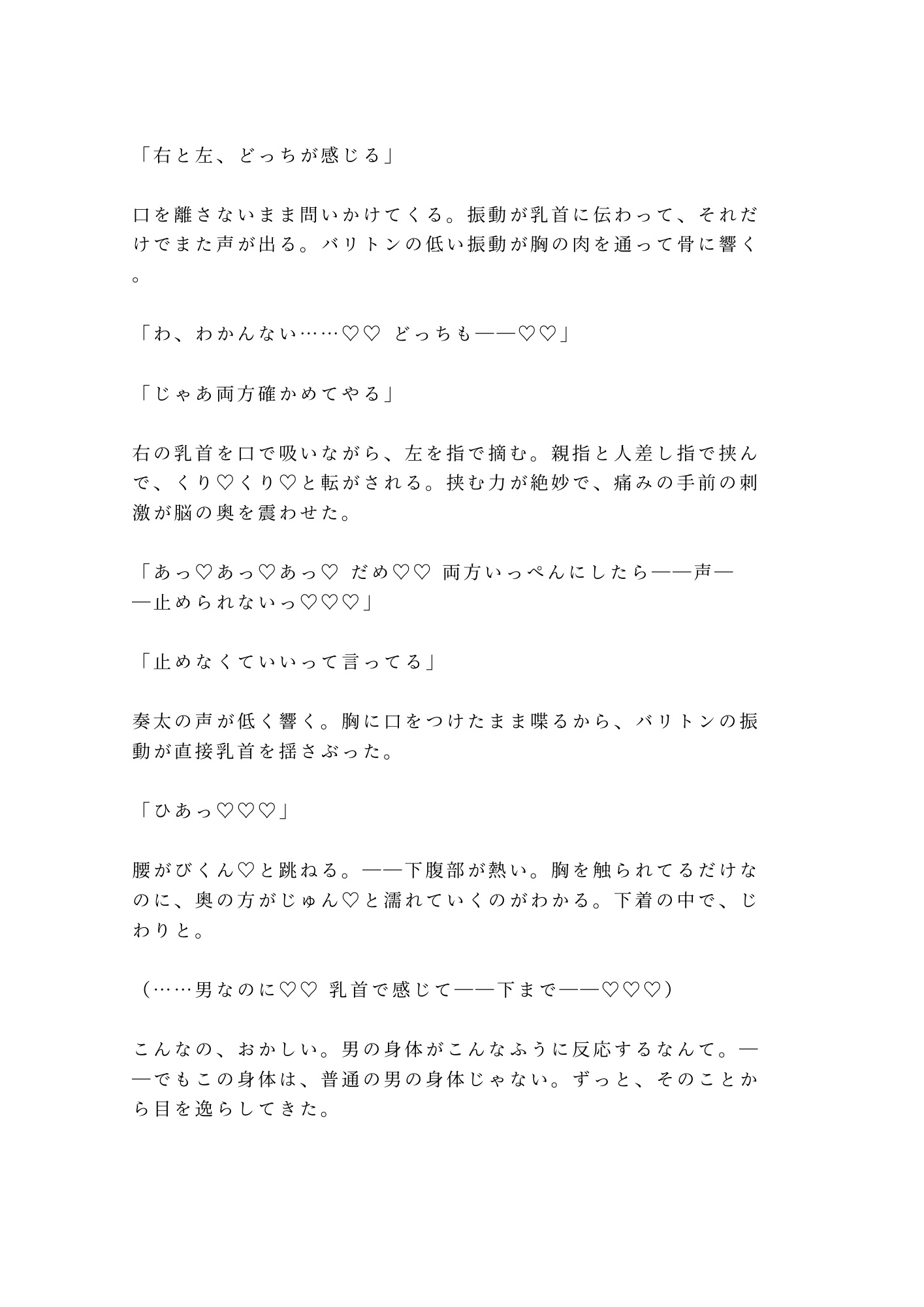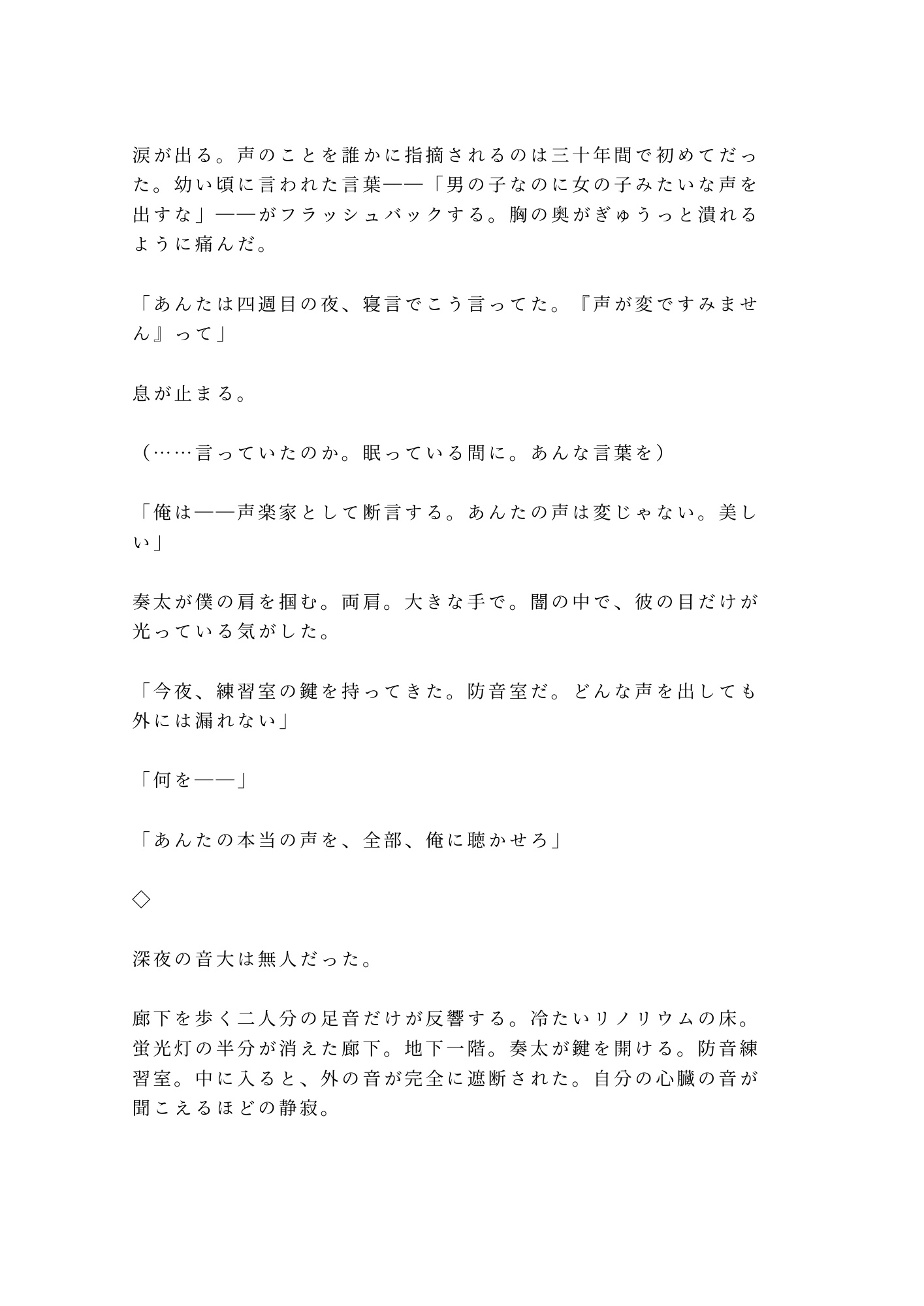 深夜の音大、防音練習室。ピアノの和音に導かれ、律の喉から解き放たれる声。三十年間封じてきた、高くて甘い、どこにも分類できない声。そして声と一緒に曝け出される身体の秘密——。