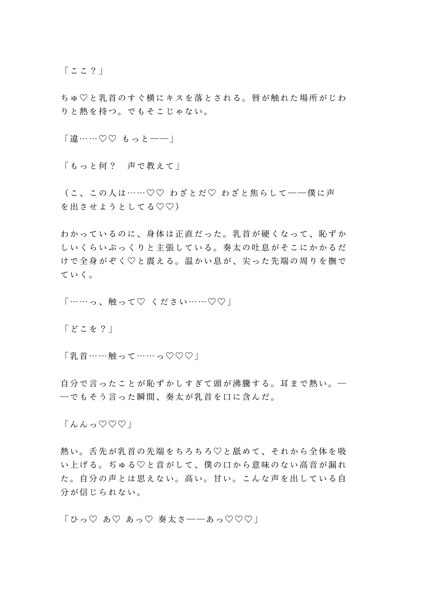 声にコンプレックスを持つ図書館司書・律は、不眠治療のため声楽家・奏太と「添い寝だけの契約」を結ぶ。毎週土曜の夜、触れない約束——だが律の身体は眠るたび奏太に近づき、寝言で彼の名を呼んでしまう。三十年間封じてきた「本当の声」を奏太に暴かれた夜、深夜の防音練習室で二人きり。「全部、俺に聴かせろ」——声で繋がる、新感覚BL官能。